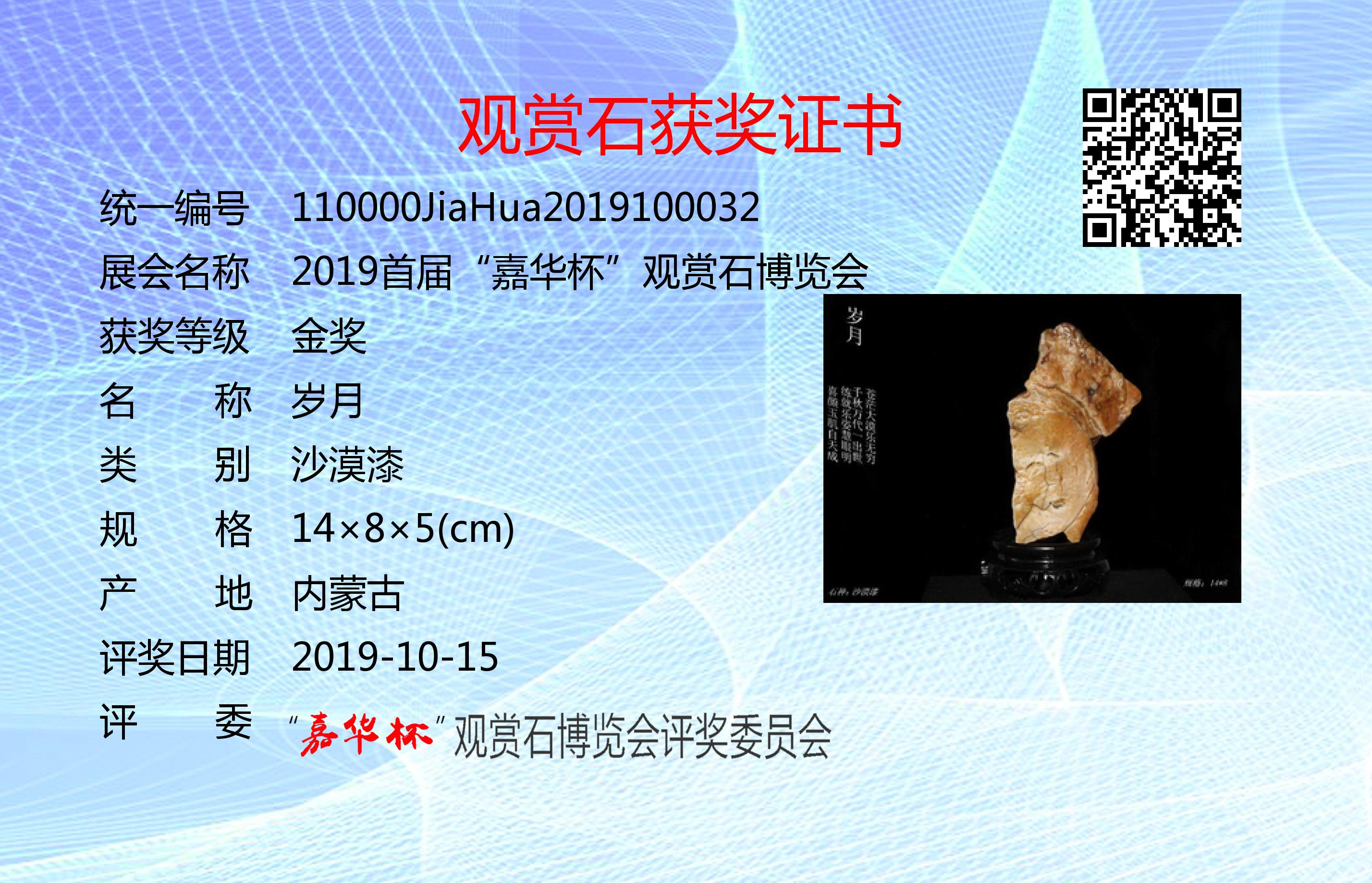喜颜玉肌自天成,练就乐姿慧眼明,千秋万代一出世,苍茫大漠乐无穷。标价1.2亿元。本网络博览会每年举办一届。每周的星期六为鉴定评奖日。首届“嘉华杯”证书上评奖日期统一为:2019年10月15日