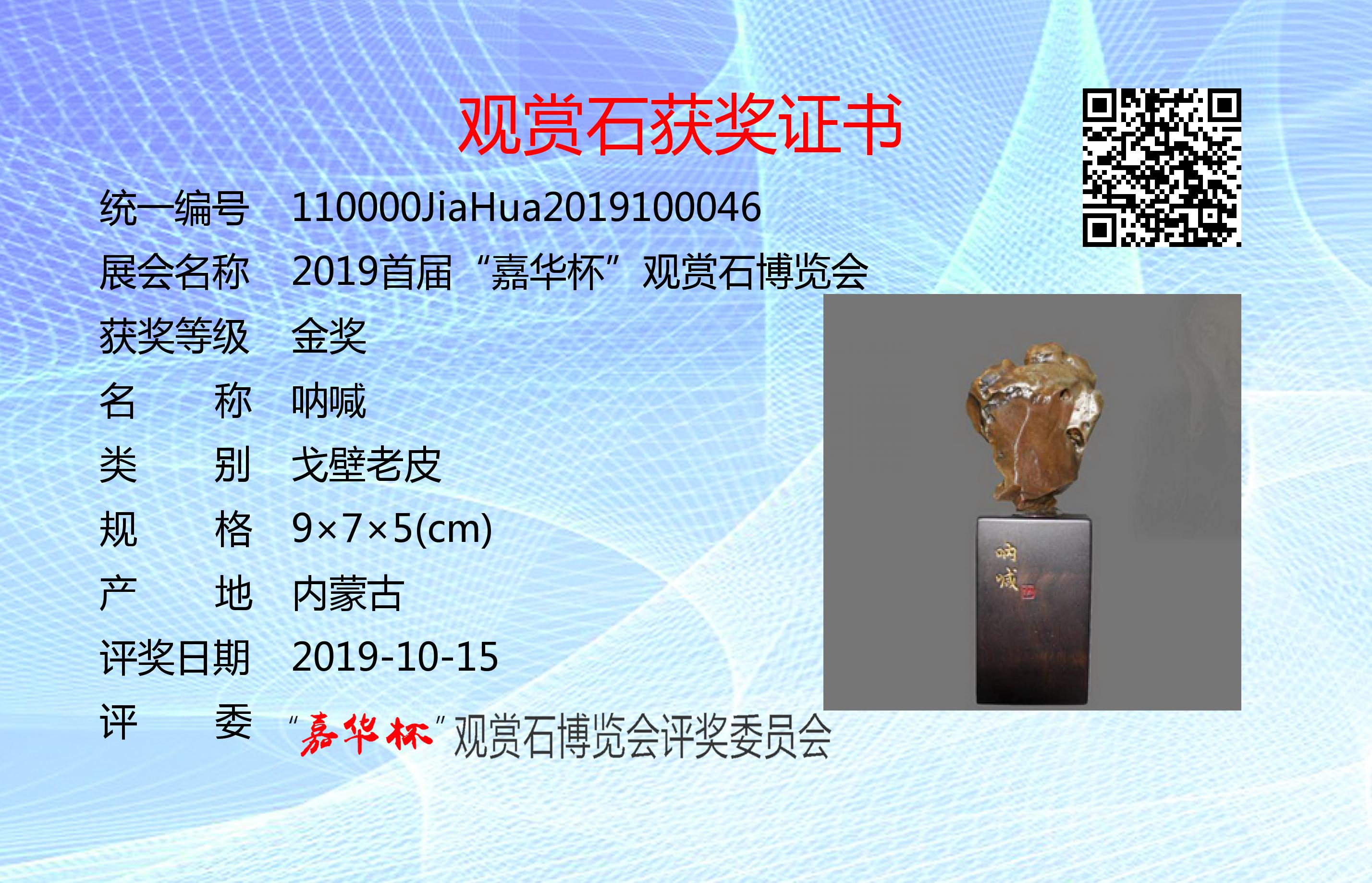 鬼斧神工天铸成,苍山桑海疑目中,试问朋友岁几何,戈壁深处亿年翁。本网络博览会每年举办一届。每周的星期六为鉴定评奖日。首届“嘉华杯”证书上评奖日期统一为:2019年10月15日