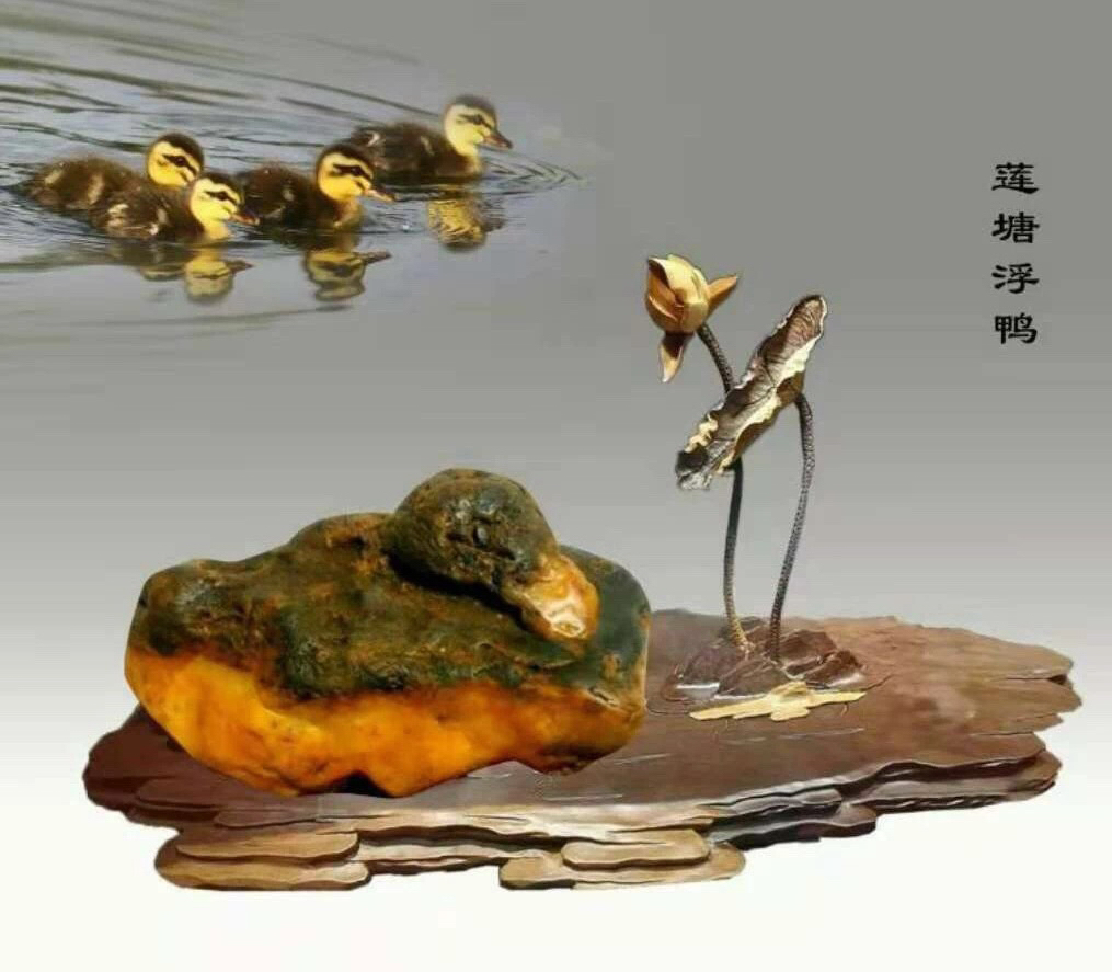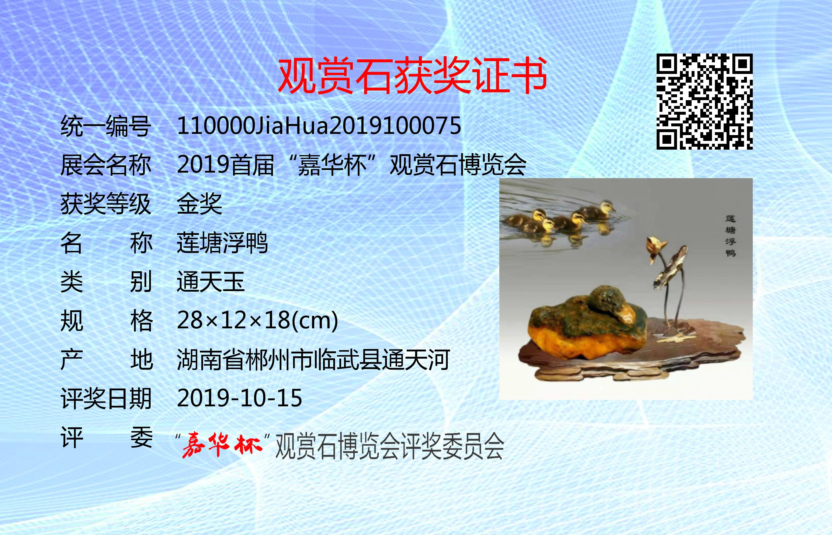 本网络博览会每年举办一届。每周的星期六为鉴定评奖日。首届“嘉华杯”证书上评奖日期统一为:2019年10月15日。玉奇石《莲塘浮鸭》集天地之灵气,日月之精华,是大自然鬼斧神工之杰作!是一方形、质、色、纹、韵俱佳的玉奇石绝品!它产自湖南省郴州市临武县通天山脚下的通天河,是湖南省唯一的特产玉种——通天玉!玉质细腻、温润通透、无棉无裂玉化好,接近黄高冰料!整方奇石长28厘米,宽12厘米,高18厘米,重5.8千克。鸭头、眼、嘴、背、身与真实“临武鸭”1:1比例完美吻合,具象率高达98%!人们一眼就知道是神鸭,无半点牵强附会!又是一方大小适宜,轻重得当的文人案头雅玩!神鸭色彩艳丽,层次分明,黄的嘴身,灰的头背,灰黄和谐互补,纹理清晰,黄金搭配!它更是一只神韵十足的鸭!食囊鼓胀,脖子微微后仰自信,饱食无忧状,神情悠然安详,让人一看顿生静谧之感!‘‘好马配好鞍’’!《莲塘浮鸭》底座坚持“大美至简”的原则,没有繁琐的雕刻,一花一叶一池塘,主次分明、遥相呼应、整体简洁、虚实有度、留白得体、韵味无穷。更绝的是它与宋代著名绢画《莲塘乳鸭图》有异曲同工之妙!一石一画相得益彰!让人不禁感叹:玉奇石《莲塘浮鸭》不用笔墨不用刀,本身自成一幅画!难道不是一个伟大的奇观吗?