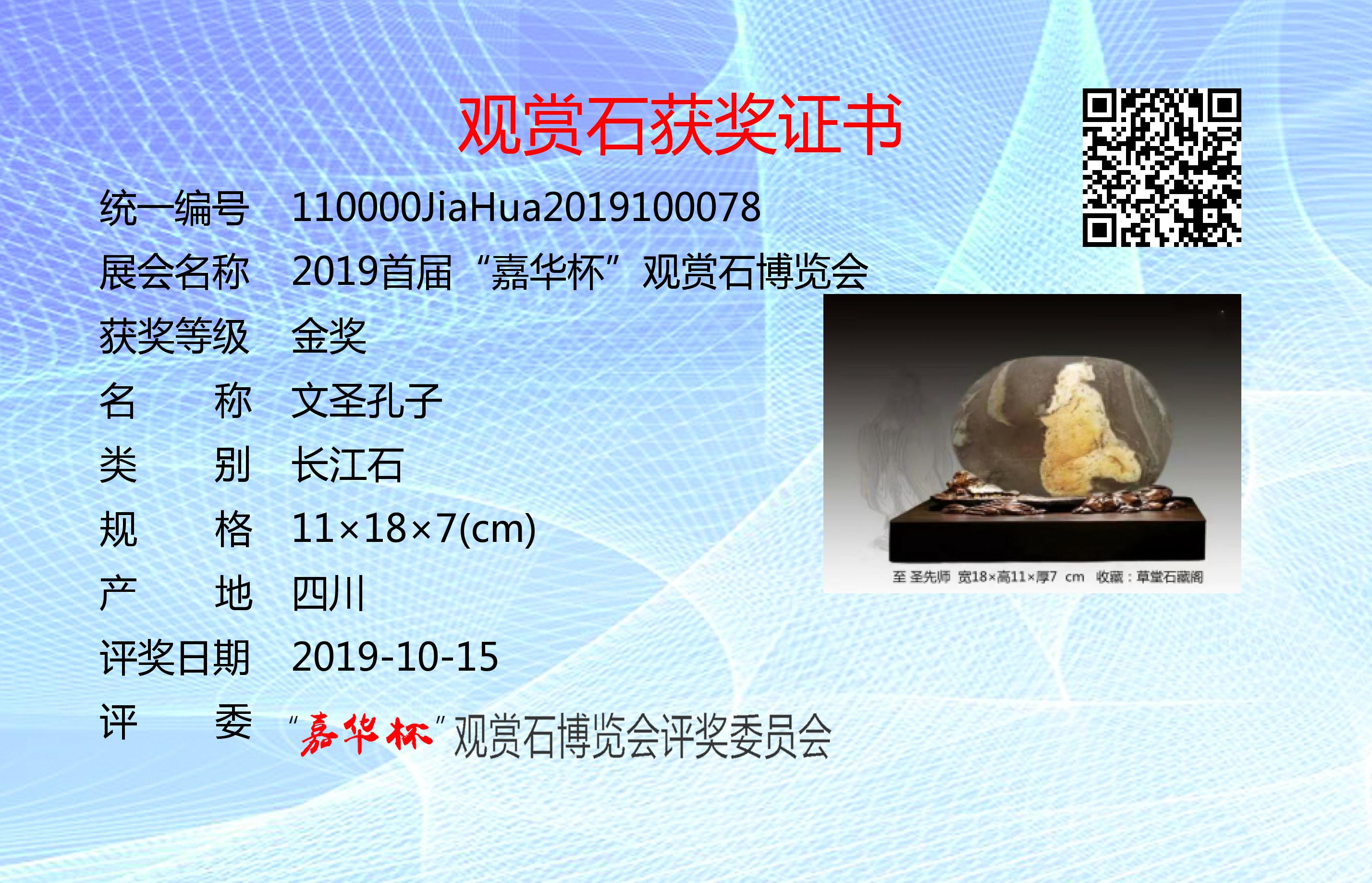 本网络博览会每年举办一届。每周的星期六为鉴定评奖日。首届“嘉华杯”证书上评奖日期统一为:2019年10月15日。此石为长江画面石,石型椭圆,石质好,人物图案形象逼真,与真人敢媲美。天然原石,出自鬼斧神工之手,具有收藏价值,观赏价值为一体的精品人物奇石。赏析:《文圣孔子》主要内容简介:提起圣人,人们可能会肃然而有敬畏之感。因为在人们心目中。圣人是品德极高而又无事不通的人,仰之弥高,我们这些凡人只有匍匐在他们脚下诚惶诚恐。千百年来,大家不就是这样顶礼膜拜文圣孔丘、武圣关羽的吗?中国最著名的老师是谁?那还用问,自然是“至圣先师”——孔老夫子。孔子的一生大部分时间都从事教育工作,他教出不少有知识有才能的学生,相传所收弟子多达三千人,特别优秀的有七十二人。那时有钱人家的孩子才有资格去学校读书,孔子自己办学就让穷人家的孩子也有书读。孔子一生中有一大半的时间,是从事传道、授业、解惑的教育工作。他创造了卓有成效的教育、教学方法总结、倡导了一整套正确的学习原则;形成了比较完整的教学内容体系;提出了一系列有深远影响的教育思想;树立了良好的师德典范。孔子的教育思想影响了整个中华民族的教育,比如他坚持“因材施教”,对待不同的学生要用不同的方法。