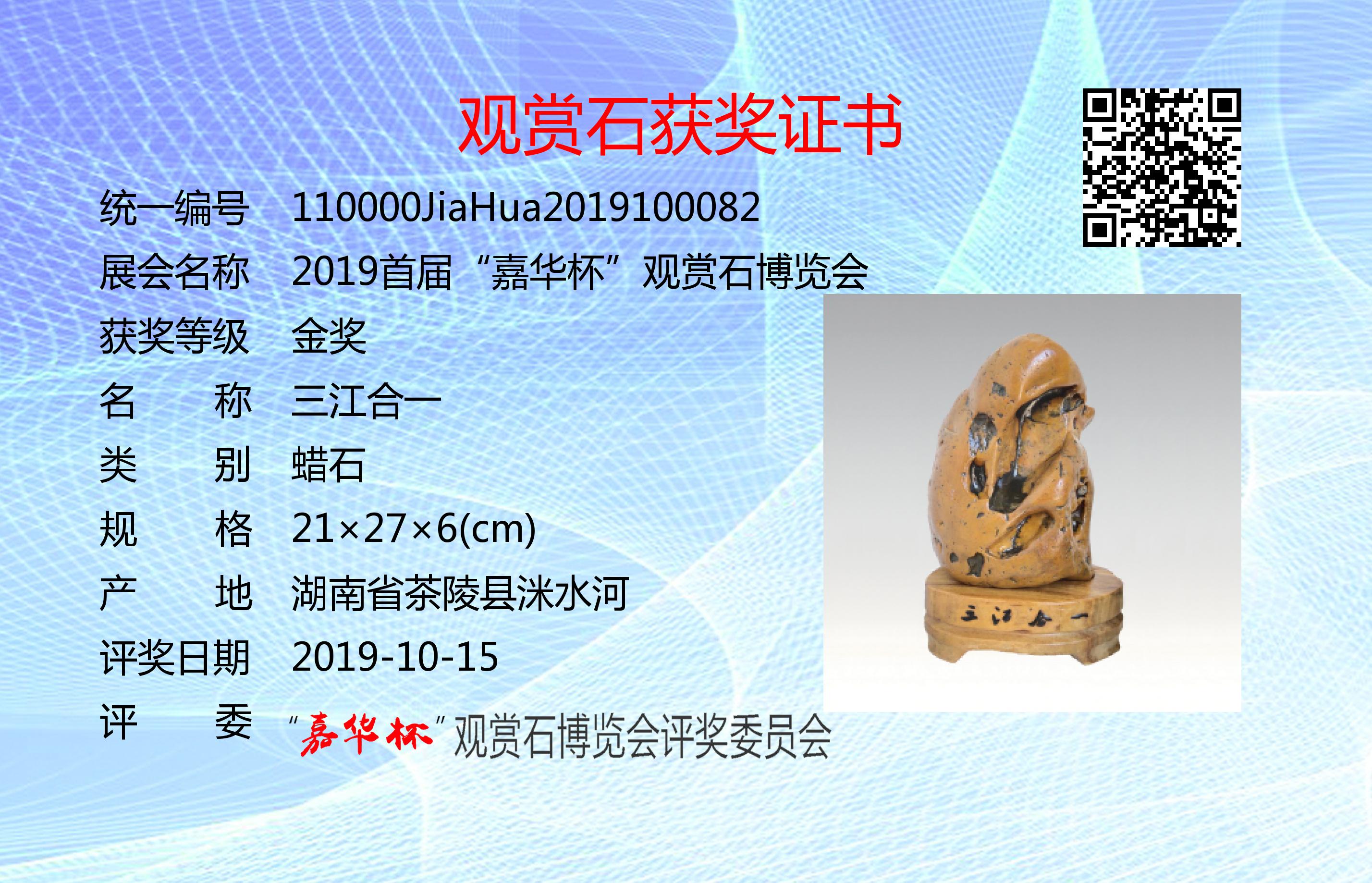 本网络博览会每年举办一届。每周的星期六为鉴定评奖日。首届“嘉华杯”证书上评奖日期统一为:2019年10月15日。一方石头上面赫然呈现四个字——“三江合一”,天工造物,书理精妙,惊奇之余唯有赞叹!