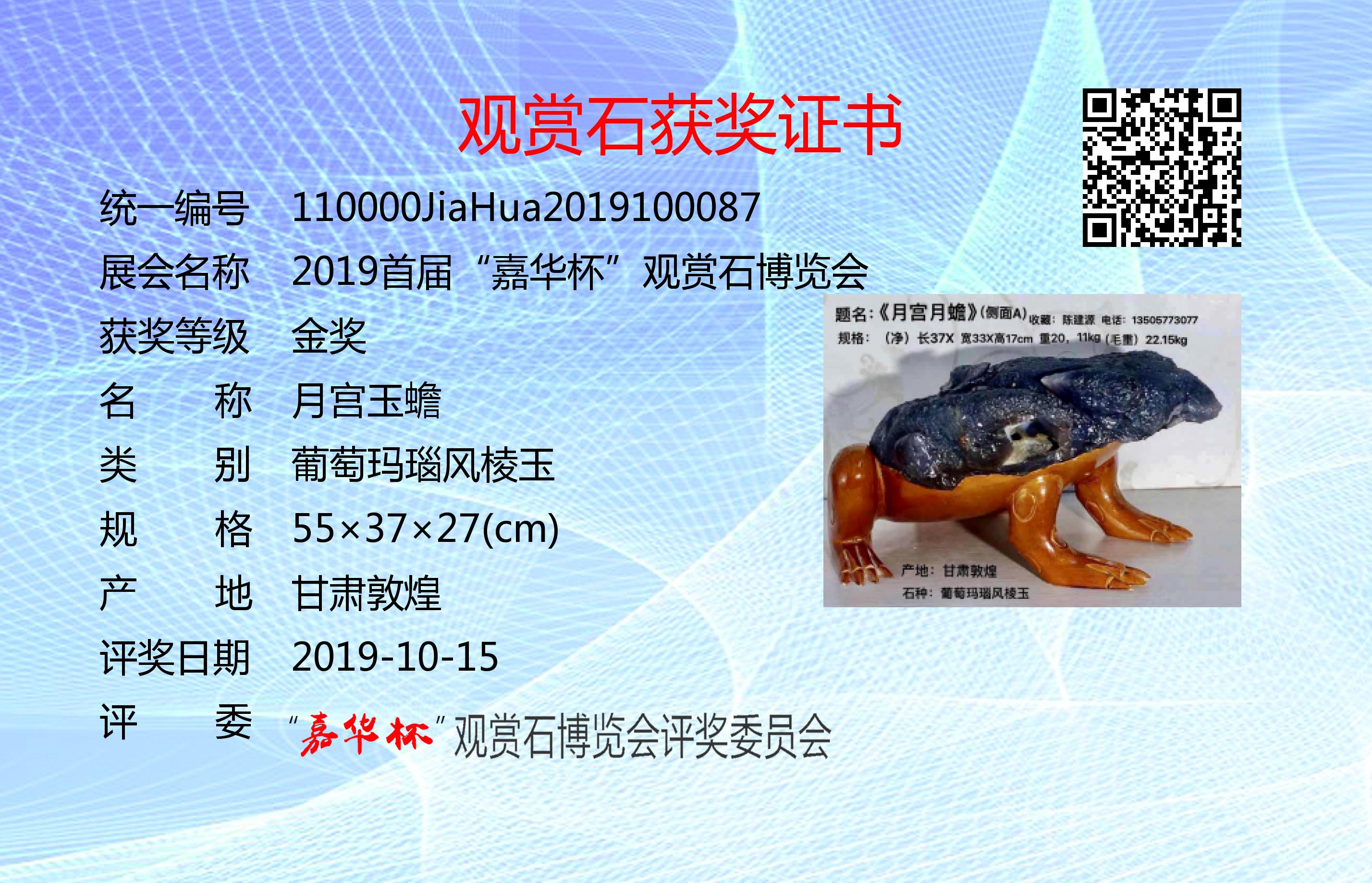 本网络博览会每年举办一届。每周的星期六为鉴定评奖日。首届“嘉华杯”证书上评奖日期统一为:2019年10月15日。赏析:月宫玉蟾下界归隐敦煌后,被东南沿海的人们(含海南省文笔峰的玉蟾宫)贡为招财吉祥之物。