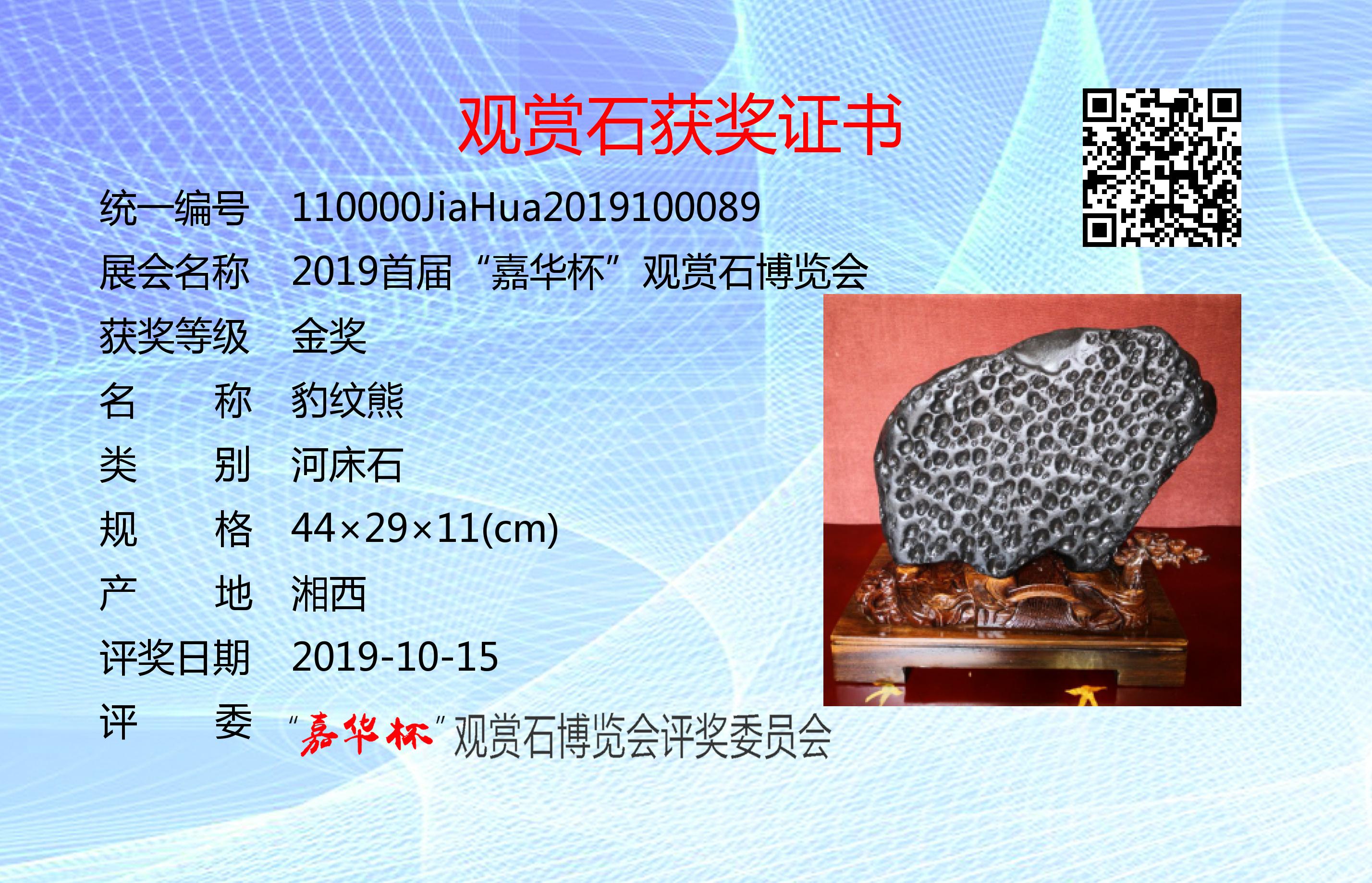 本网络博览会每年举办一届。每周的星期六为鉴定评奖日。首届“嘉华杯”证书上评奖日期统一为:2019年10月15日。赏析:豹纹熊:产于湘西沅水上游锦江河,纯天然,石质硬度高,级理酷似豹纹,型如北极大熊,栩栩如生。转让价:180000元。