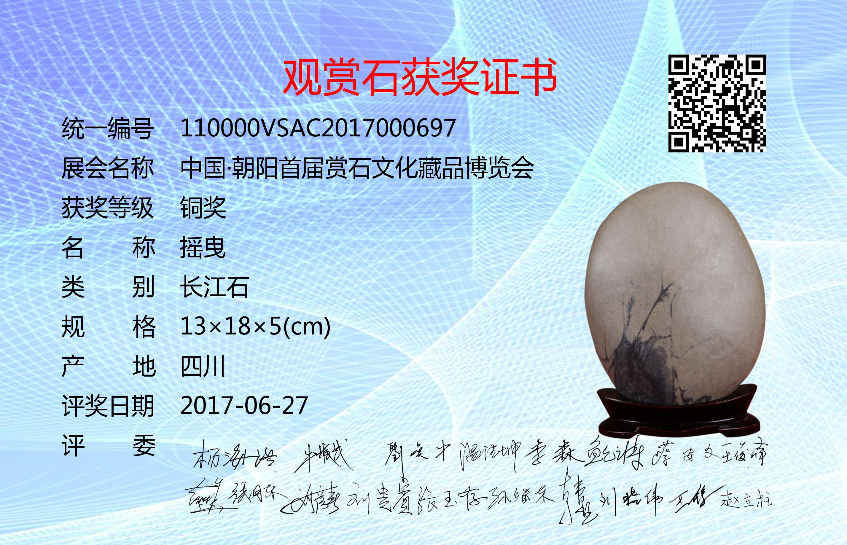 朝阳首届赏石文化藏品博览会评奖委员会成员:杨海浩、牛振武、刘焕中、温德坤、李森、鲍云涛、蔡安文、王俊峰、赵胜华、张月东、刘彦春、刘贵宾、张玉存、孙继东、韩墅、刘晓伟、王锋、赵立柱。