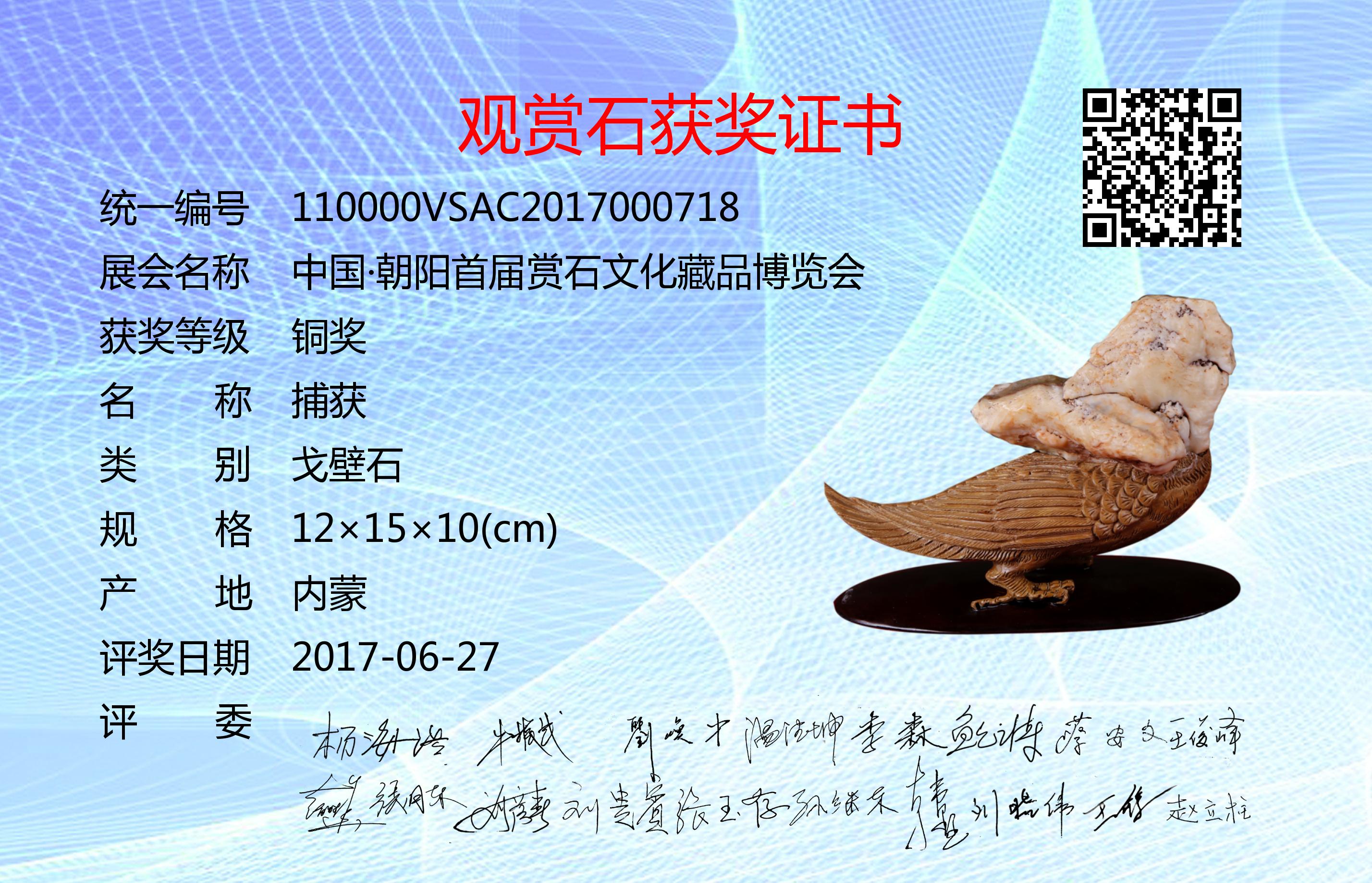 朝阳首届赏石文化藏品博览会评奖委员会成员:杨海浩、牛振武、刘焕中、温德坤、李森、鲍云涛、蔡安文、王俊峰、赵胜华、张月东、刘彦春、刘贵宾、张玉存、孙继东、韩墅、刘晓伟、王锋、赵立柱。