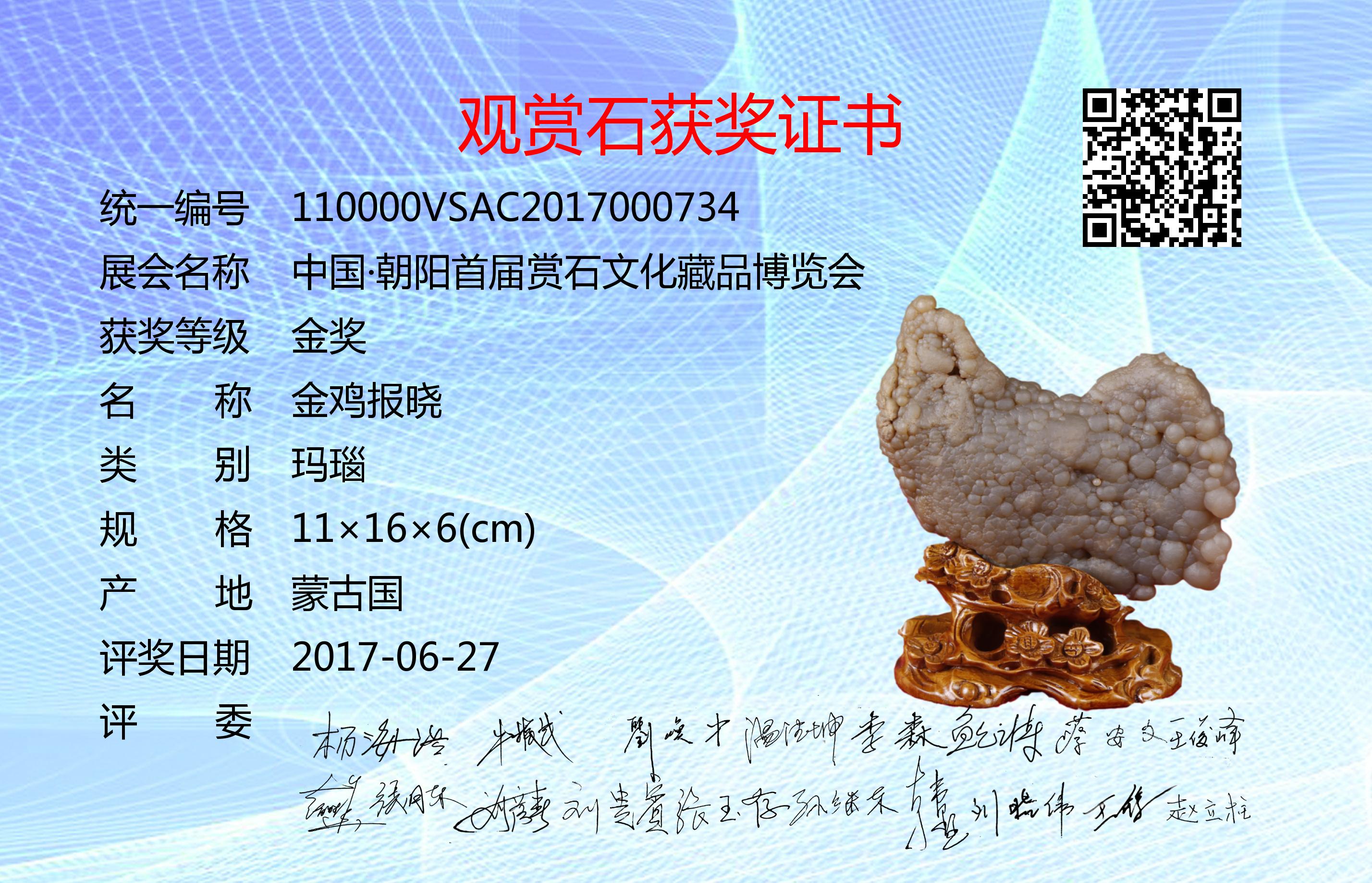 朝阳首届赏石文化藏品博览会评奖委员会成员:杨海浩、牛振武、刘焕中、温德坤、李森、鲍云涛、蔡安文、王俊峰、赵胜华、张月东、刘彦春、刘贵宾、张玉存、孙继东、韩墅、刘晓伟、王锋、赵立柱。