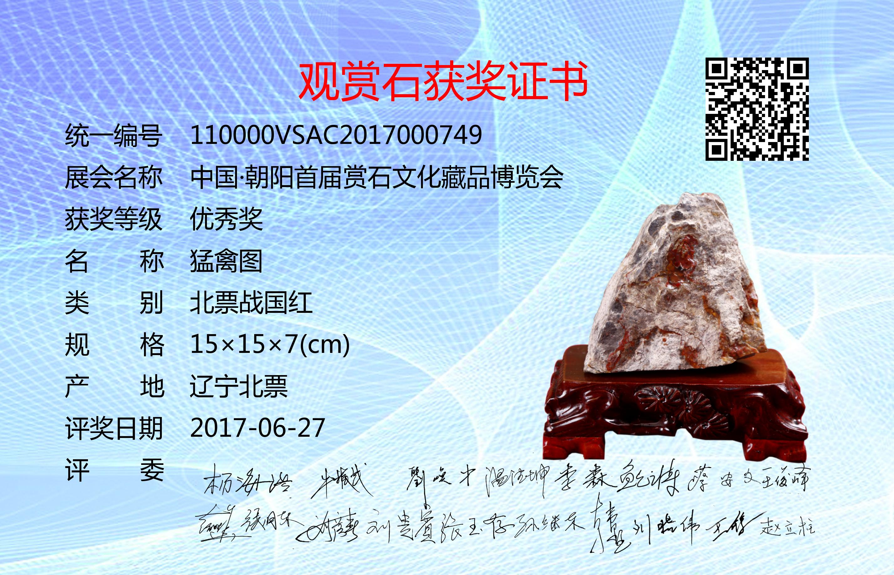 朝阳首届赏石文化藏品博览会评奖委员会成员:杨海浩、牛振武、刘焕中、温德坤、李森、鲍云涛、蔡安文、王俊峰、赵胜华、张月东、刘彦春、刘贵宾、张玉存、孙继东、韩墅、刘晓伟、王锋、赵立柱。