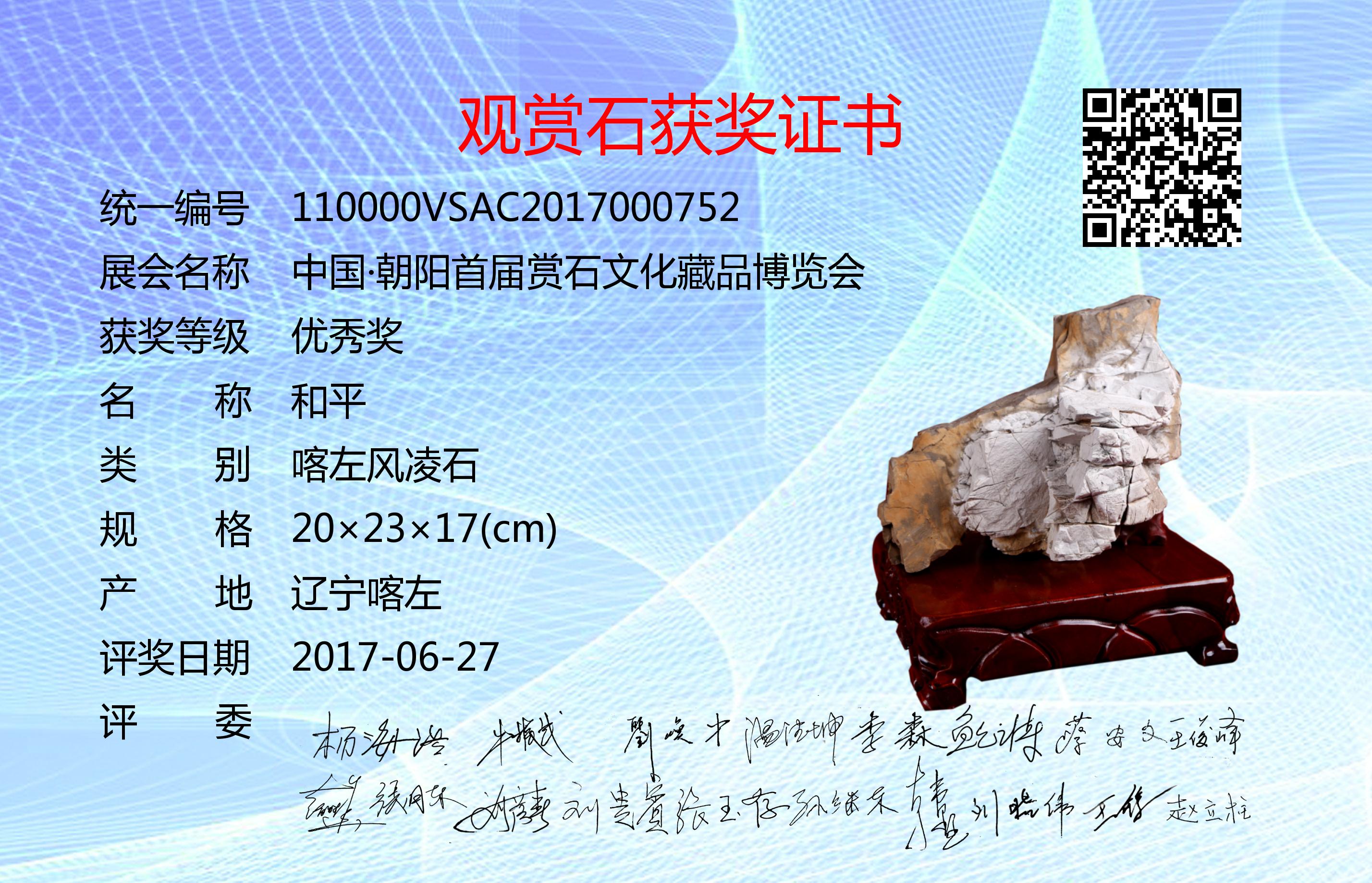 朝阳首届赏石文化藏品博览会评奖委员会成员:杨海浩、牛振武、刘焕中、温德坤、李森、鲍云涛、蔡安文、王俊峰、赵胜华、张月东、刘彦春、刘贵宾、张玉存、孙继东、韩墅、刘晓伟、王锋、赵立柱。