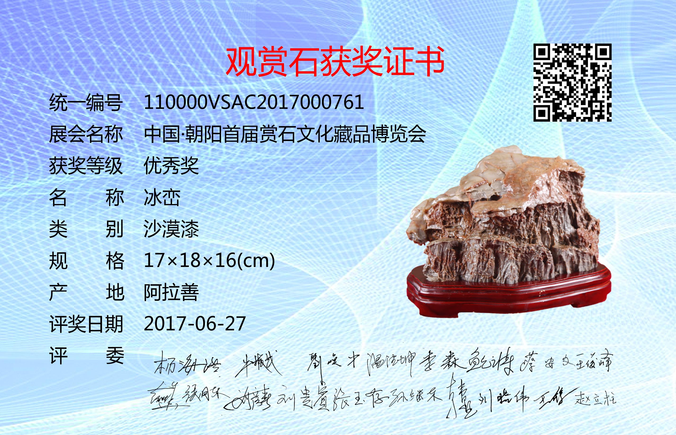 朝阳首届赏石文化藏品博览会评奖委员会成员:杨海浩、牛振武、刘焕中、温德坤、李森、鲍云涛、蔡安文、王俊峰、赵胜华、张月东、刘彦春、刘贵宾、张玉存、孙继东、韩墅、刘晓伟、王锋、赵立柱。
