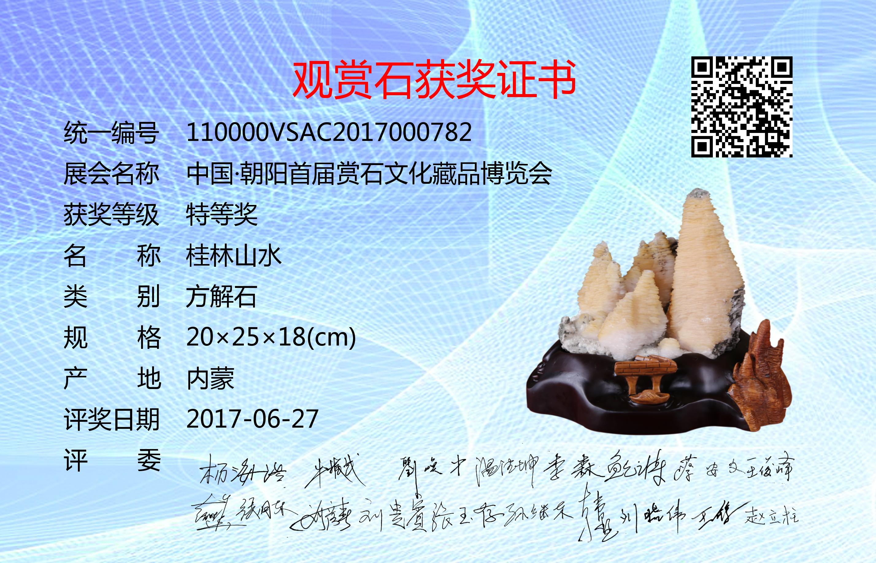 朝阳首届赏石文化藏品博览会评奖委员会成员:杨海浩、牛振武、刘焕中、温德坤、李森、鲍云涛、蔡安文、王俊峰、赵胜华、张月东、刘彦春、刘贵宾、张玉存、孙继东、韩墅、刘晓伟、王锋、赵立柱。