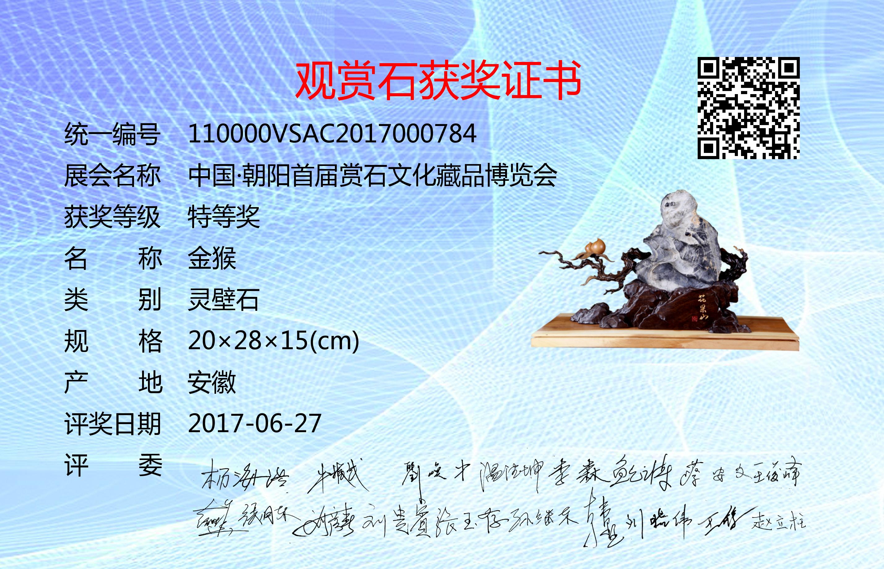 朝阳首届赏石文化藏品博览会评奖委员会成员:杨海浩、牛振武、刘焕中、温德坤、李森、鲍云涛、蔡安文、王俊峰、赵胜华、张月东、刘彦春、刘贵宾、张玉存、孙继东、韩墅、刘晓伟、王锋、赵立柱。