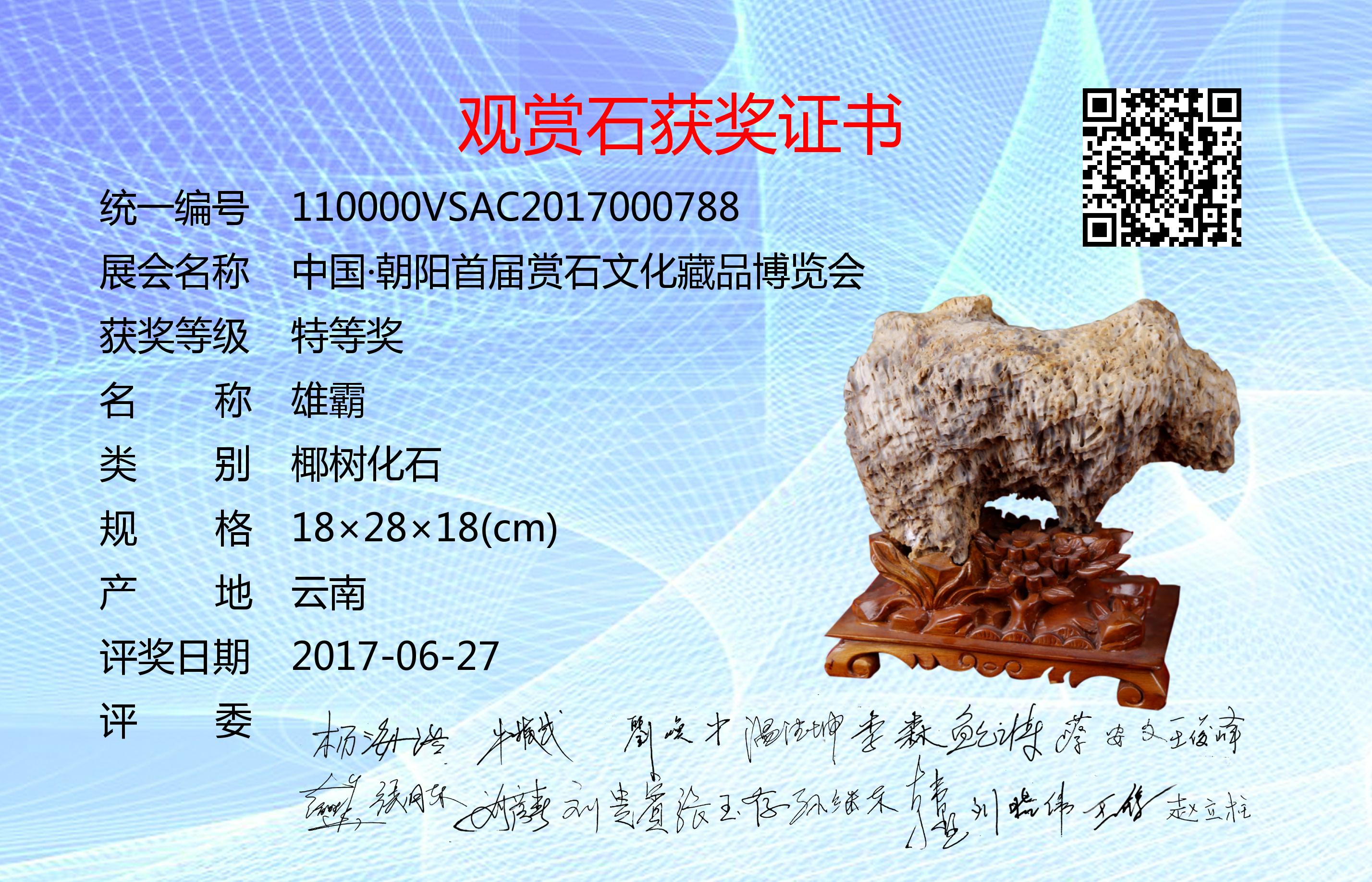 朝阳首届赏石文化藏品博览会评奖委员会成员:杨海浩、牛振武、刘焕中、温德坤、李森、鲍云涛、蔡安文、王俊峰、赵胜华、张月东、刘彦春、刘贵宾、张玉存、孙继东、韩墅、刘晓伟、王锋、赵立柱。