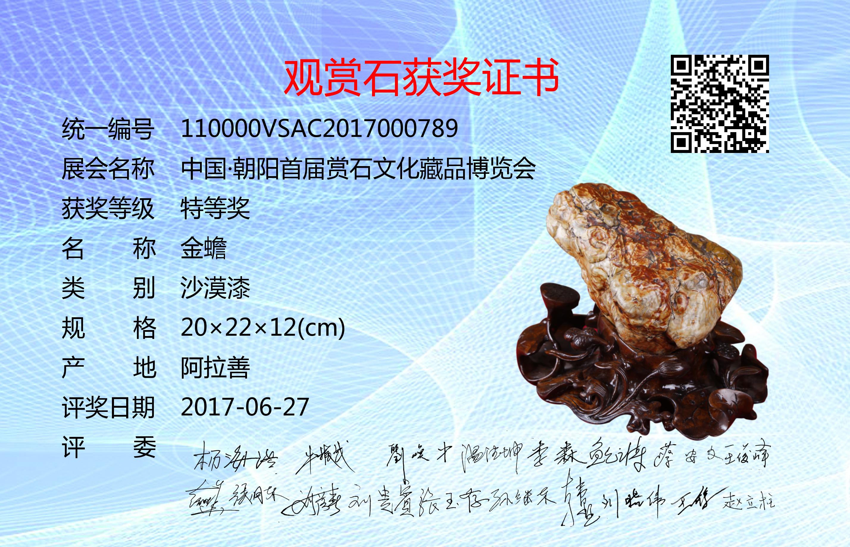 朝阳首届赏石文化藏品博览会评奖委员会成员:杨海浩、牛振武、刘焕中、温德坤、李森、鲍云涛、蔡安文、王俊峰、赵胜华、张月东、刘彦春、刘贵宾、张玉存、孙继东、韩墅、刘晓伟、王锋、赵立柱。