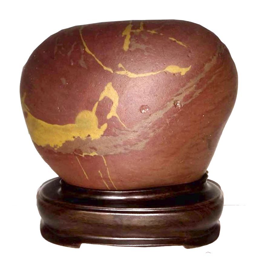 评委:沈宽、王晶、石兵;监委:田建一。赏析:本石种为长江石中的长江红,石质致密,整体外形犹如一颗苹果,本石也可以做为造型石来欣赏。本石画面感很强,红色做为背景,黄色中有一圆形黄色区域,似傍晚的夕阳。整体画面呈现的是一幅夕阳西下时的精彩画面。
