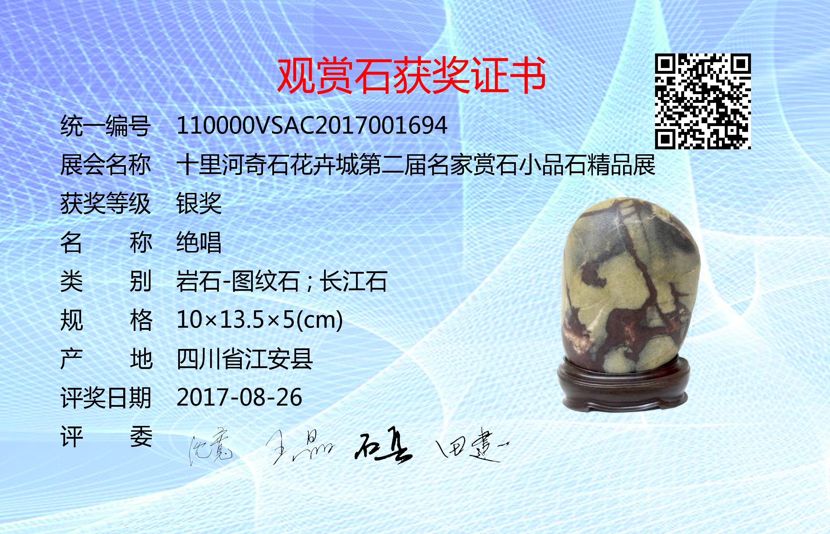 评委:沈宽、王晶、石兵;监委:田建一。赏析:本石为长江画面石,画面色差对比明显,石质致密,在画面的右侧有一只小鸟,在昂首高歌,上部灰色部分,犹如若隐若现的高山密林。整体画面给人一空旷神怡之感。