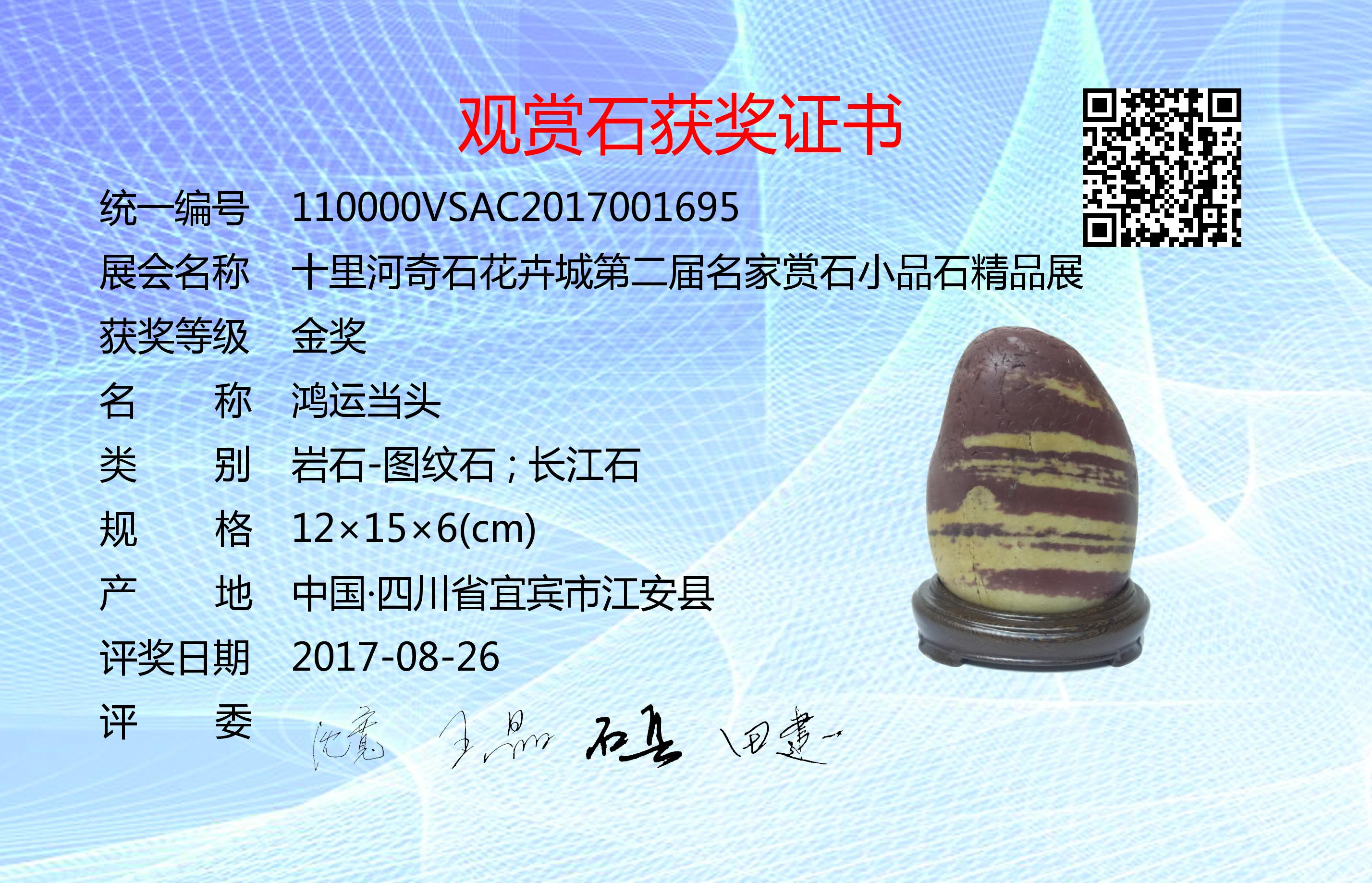 评委:沈宽、王晶、石兵;监委:田建一。赏析:从种类上讲,此石属长江石中长江红;从质地及色彩角度,此石达到长江红中的红碧玉等级。红碧玉是石英家族中的一员,主要成份为SiO2。红碧玉又可细分为多个小类,此石属于红碧玉中的红黄彩级别。红黄彩亦称“红黄彩石”、“彩碧玉”,红、黄两色交融,以红为主,黄多为条纹状、块状散布、交织,因“红配黄、喜洋洋”,被石友们称为吉庆石、富贵石。此石上部为红色,下部红黄交融,命题为鸿运当头,寓意吉祥、恰当,石质坚硬,指甲纹明显,是一方难得的长江红小精品。