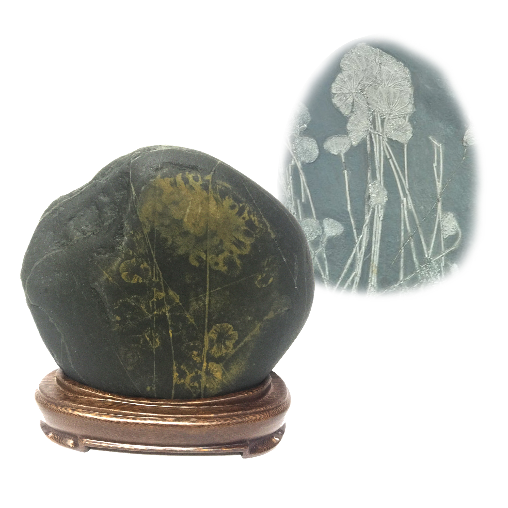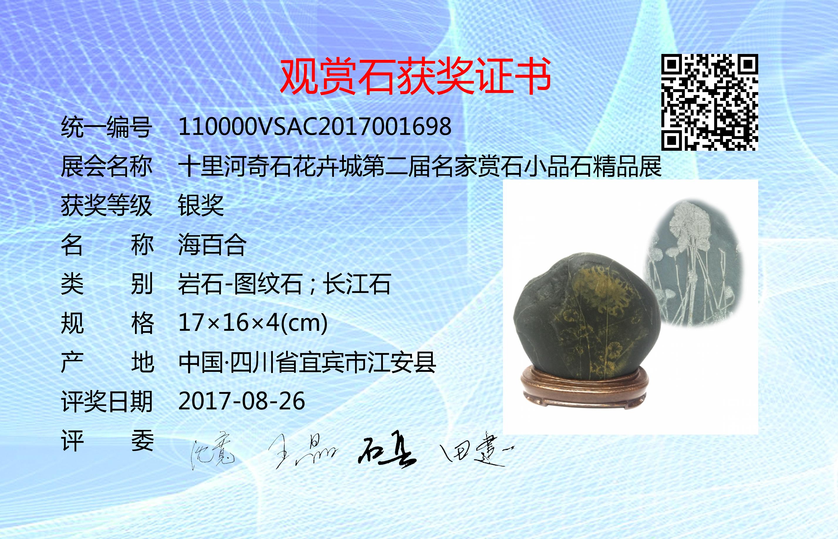 评委:沈宽、王晶、石兵;监委:田建一。赏析:海百合是一种始见于早寒武纪世的棘皮动物,生活于海里,具多条腕足,身体呈花状,表面有石灰质的壳,由于长得像植物,人们就给它们起了海百合这么个植物的名字。海百合死后形成了化石。此石属长江图纹石,并非化石,但该画面从整体形态、结构等均与海百合化石具有异曲同工之处,达到了化石所展现的韵味,是一方极其少见的精品观赏石。