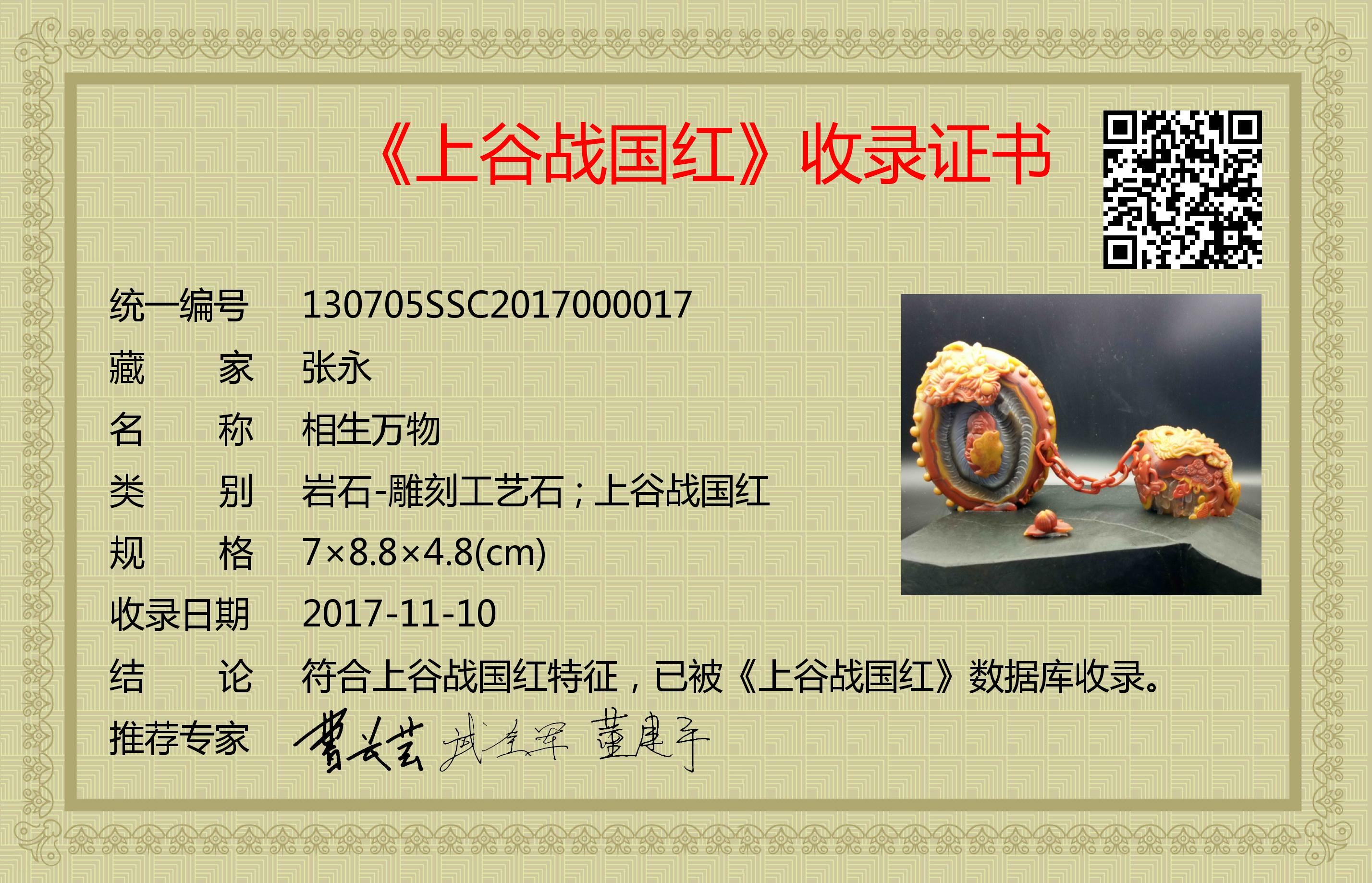- 备注战国红—大自然赋予的旷世奇宝,战国时期是尊贵的象征,只有皇家贵族才拥用。后来一直被大自然孕育着直到现在又重新被发现,可以说是上天给我们当代的机会,所以每一件好宝贝都是值的收藏。值的留给我们的后人。此宝贝先说原石以红黄为主冻料依衬艳而不杂,线条清晰,整体美感强。然后就是雕工,雕刻采用高难度风险大的立体圆雕和镂空雕。雕刻师是下了功夫的杰作。作为一件艺术品主题和中国的传统文化想结合《相生万物》:“一生二,二生三,三生万物”正好也是战国红协会标志的含义。相生万物有容乃大,象征着国大家大肚量大,再加上有龙王的护佑必成大事。万物想生相克,无下则无上;无低由无高,无苦则无甜;唯累过方得闲;唯苦过方知甜。浩浩宇宙人若尘埃,分什么强弱贵贱,行善作恶终归有报,看因果轮回循环让我们爱惜生灵,心存敬畏,与万物相生,享和谐自然。
