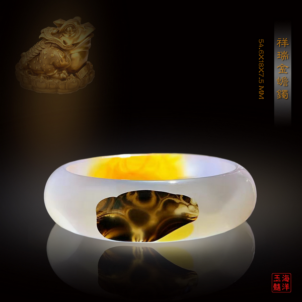 图纹文化,祥瑞金蟾镯,画入眼,意沁心,画风古朴,清晰典雅。完美的格调,优益的品质,霸气中带着一股沁人心魂的文化。蟾,是种吉祥的寓言。见蟾生钱,病魔消尽,大富大贵,有蟾相陪……,关于蟾的寓意太多,也都很好,有兴趣的可以查下资料。解石,我只作个引导的窗口,窗外的世界自己走出去看。