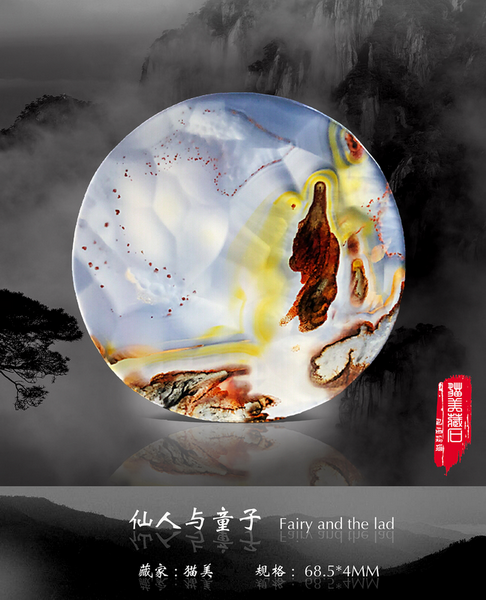 雲径天蹊,霞光瑞气,石如画,画如石。画面整体,布局得当,天地有空。 流光溢彩大开门式的画风,色泽润心。人物行与云霞中,静中有动,动中生趣,写意又写情。意韵间前后两人把画面酝酿出情景交织的美感。童子侧身而立,像是在听观音大士嘱咐些什么。。。让人遐想连篇。观音和童子身罩金色光芒,整体意境悠然,给人以沉静感,这方石给品赏者带来什么样的画风,什么样的感观思想和趣味文化。仅以主观画面人物看,是一观音仙子和童子行与云蹊之间。轻盈的姿态,飘逸的身影,在清风徐徐间,心静气宁,欣然前行。