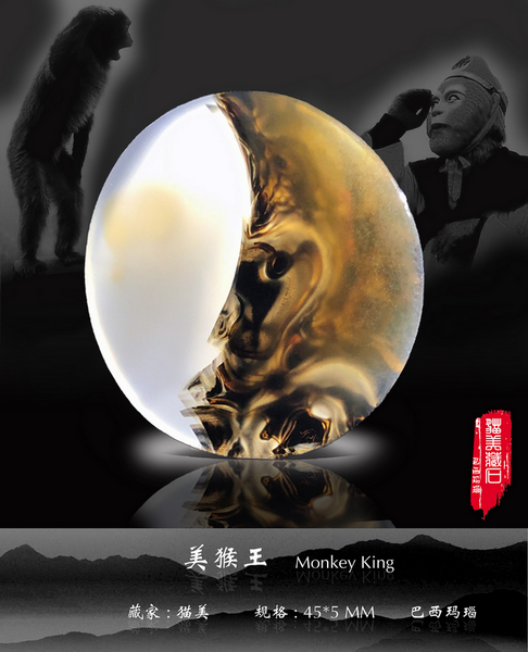 三维立体画面,内含图案,色彩和脸部有着符合猴子特征的标志,猴脸边线条清晰可见,有五官本是难得,而眼睛有眼眶、有眼珠、有眼白、最奇妙的是还有眼神,把猴子俏皮又自认聪明的神情表达入木三分,嘴还倔强地往里瘪着,像极了什么都不服的美猴王更为巧妙的是,在下面图纹里倒过来看居然藏着个三师弟、一个身穿宽大衣袖僧袍挑着扁担的沙僧,和正图美猴王合壁在一个天画里,这是一种怎样的机缘巧合才能达到的境地。在海洋玉髓和巴西玛瑙里 象形能达到 象(具像程度 )质 (料质是否温润)色(色彩是否艳丽 色调过度是否自然)韵(画面是否比例协调 象形是否有神情 风景是否有意境)稀(画面形成难度 )美(整体画面呈现出的美感)意(能直观表达出画面的内容)都能达到的真的是寥寥无几。。。珍品都是可遇不可求 能遇见和拥有都是石缘。。。