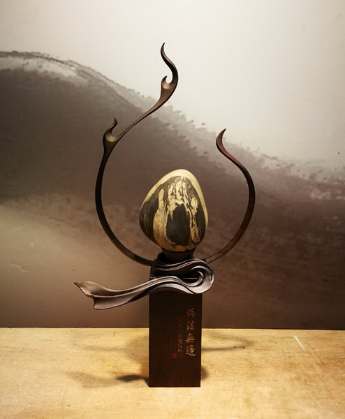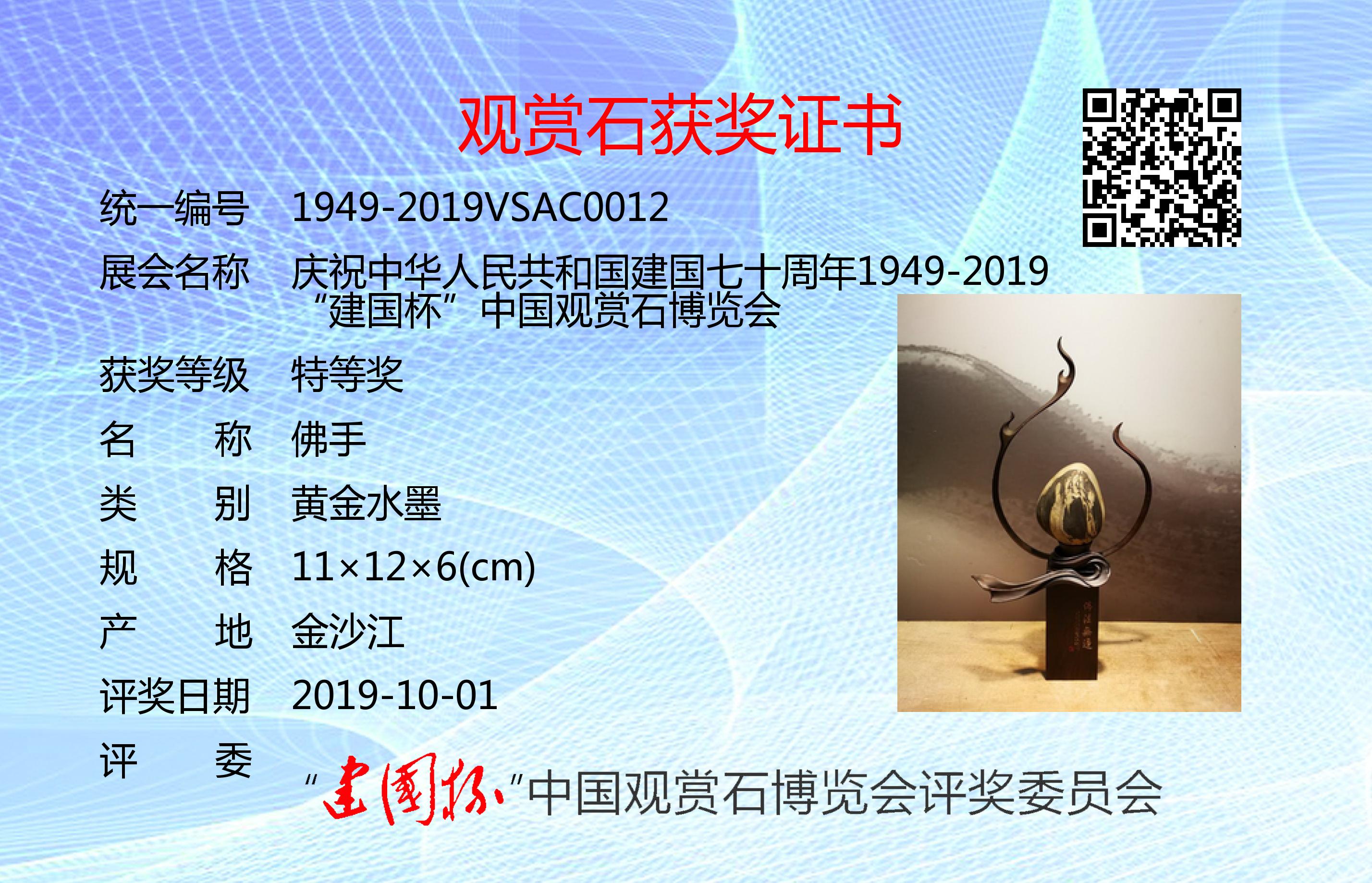 为庆祝建国七十周年,凝聚文化强国之力,推进赏石艺术发展,以最美的赏石精品向共和国生日献礼,特隆重举办了“建国杯”观赏石博览会。本次展会设特等奖、金奖、银奖、入围奖若干(各奖项不设名额限制,采用专家独立鉴评打分,平均鉴评得分91分以上获特等奖;81~90分获金奖;71~80分获银奖;61~70分获入围奖;61以下不获奖。鉴评标准:《观赏石鉴评》GB/T31390-2015)。本次评奖实际日期为2019年9月12日,为了突出纪念意义,证书上评奖日期统一为:2019年10月1日。