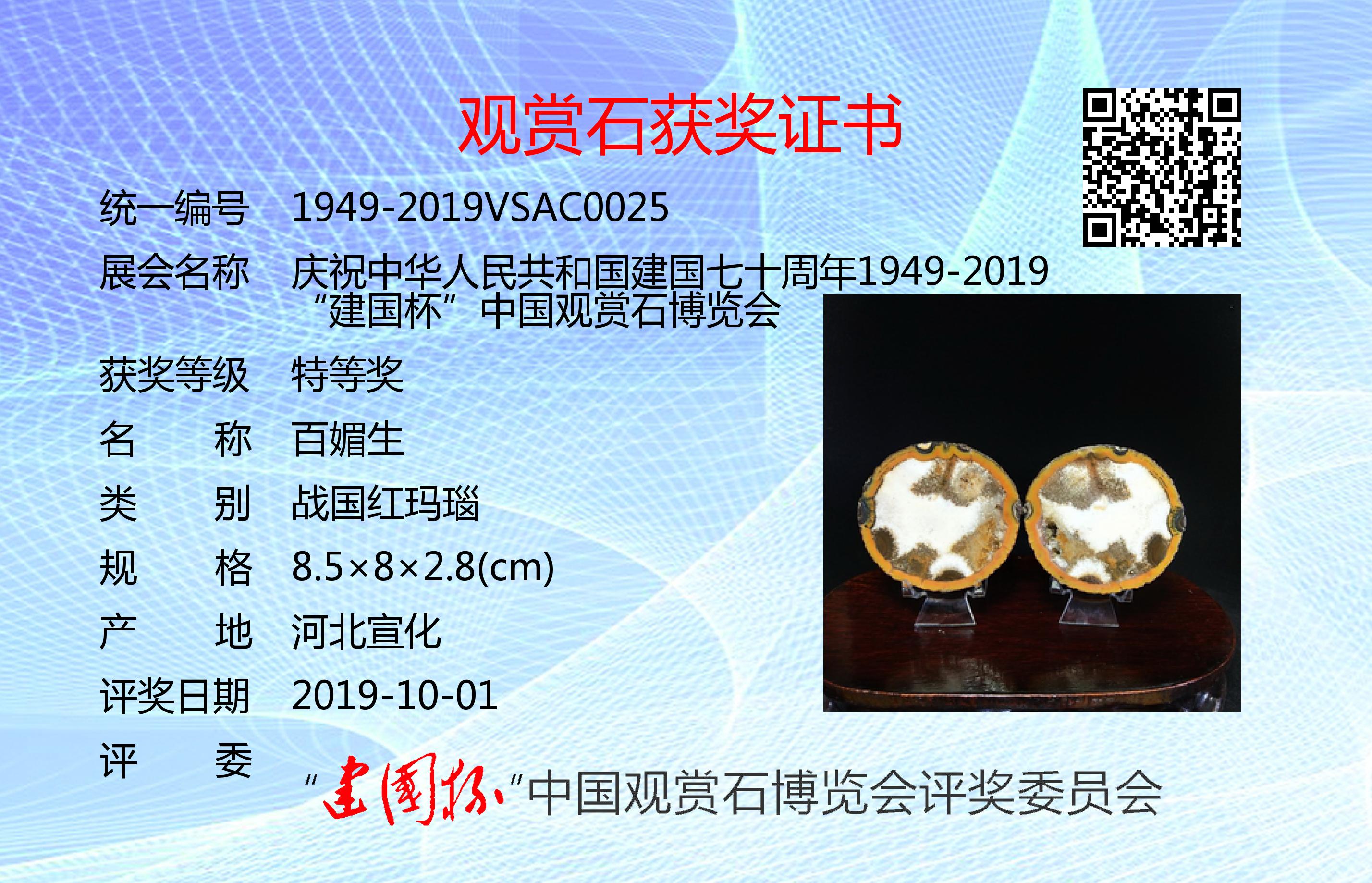 2018年被评选为中华传世名石。为庆祝建国七十周年,凝聚文化强国之力,推进赏石艺术发展,以最美的赏石精品向共和国生日献礼,特隆重举办了“建国杯”观赏石博览会。本次展会设特等奖、金奖、银奖、入围奖若干(各奖项不设名额限制,采用专家独立鉴评打分,平均鉴评得分91分以上获特等奖;81~90分获金奖;71~80分获银奖;61~70分获入围奖;61以下不获奖。鉴评标准:《观赏石鉴评》GB/T31390-2015)。本次评奖实际日期为2019年9月12日,为了突出纪念意义,证书上评奖日期统一为:2019年10月1日。