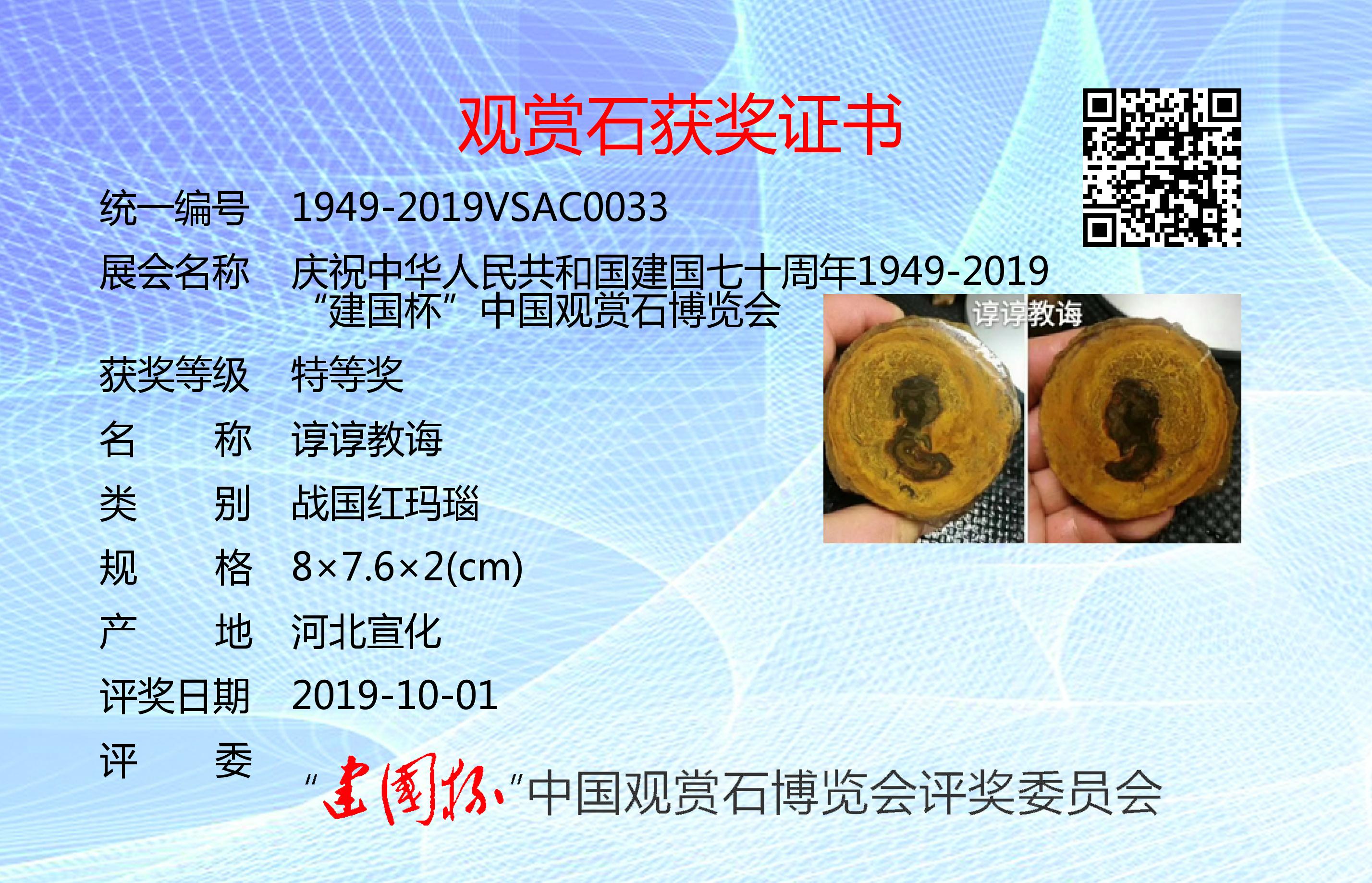 为庆祝建国七十周年,凝聚文化强国之力,推进赏石艺术发展,以最美的赏石精品向共和国生日献礼,特隆重举办了“建国杯”观赏石博览会。本次展会设特等奖、金奖、银奖、入围奖若干(各奖项不设名额限制,采用专家独立鉴评打分,平均鉴评得分91分以上获特等奖;81~90分获金奖;71~80分获银奖;61~70分获入围奖;61以下不获奖。鉴评标准:《观赏石鉴评》GB/T31390-2015)。本次评奖实际日期为2019年9月12日,为了突出纪念意义,证书上评奖日期统一为:2019年10月1日。