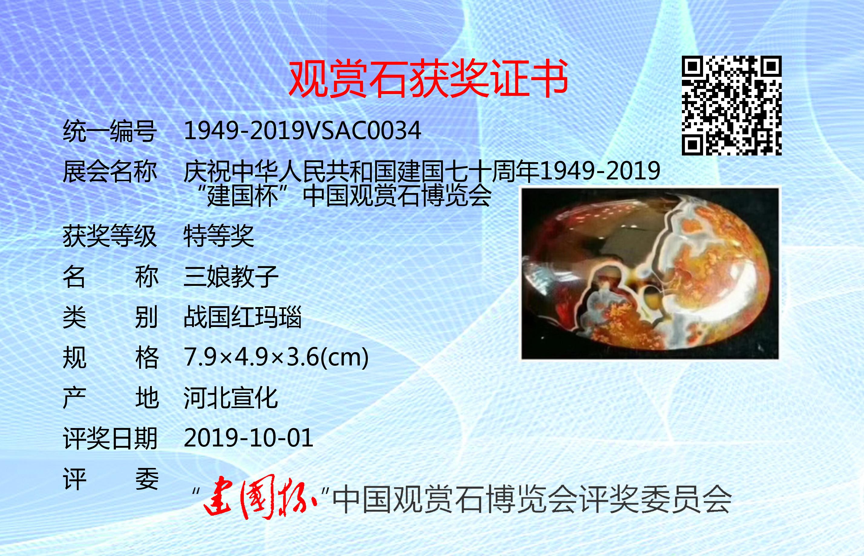 为庆祝建国七十周年,凝聚文化强国之力,推进赏石艺术发展,以最美的赏石精品向共和国生日献礼,特隆重举办了“建国杯”观赏石博览会。本次展会设特等奖、金奖、银奖、入围奖若干(各奖项不设名额限制,采用专家独立鉴评打分,平均鉴评得分91分以上获特等奖;81~90分获金奖;71~80分获银奖;61~70分获入围奖;61以下不获奖。鉴评标准:《观赏石鉴评》GB/T31390-2015)。本次评奖实际日期为2019年9月12日,为了突出纪念意义,证书上评奖日期统一为:2019年10月1日。