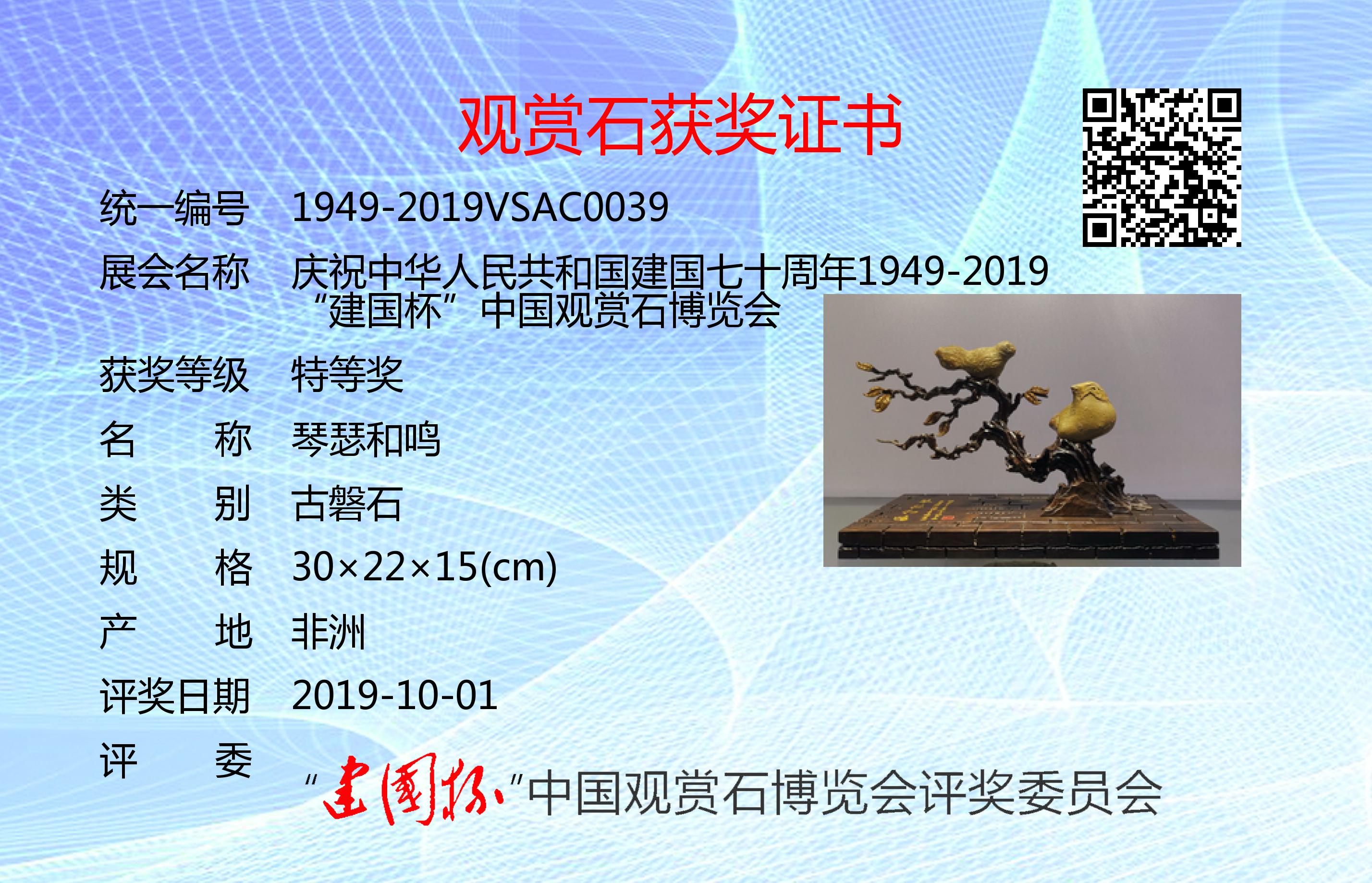 为庆祝建国七十周年,凝聚文化强国之力,推进赏石艺术发展,以最美的赏石精品向共和国生日献礼,特隆重举办了“建国杯”观赏石博览会。本次展会设特等奖、金奖、银奖、入围奖若干(各奖项不设名额限制,采用专家独立鉴评打分,平均鉴评得分91分以上获特等奖;81~90分获金奖;71~80分获银奖;61~70分获入围奖;61以下不获奖。鉴评标准:《观赏石鉴评》GB/T31390-2015)。本次评奖实际日期为2019年9月12日,为了突出纪念意义,证书上评奖日期统一为:2019年10月1日。