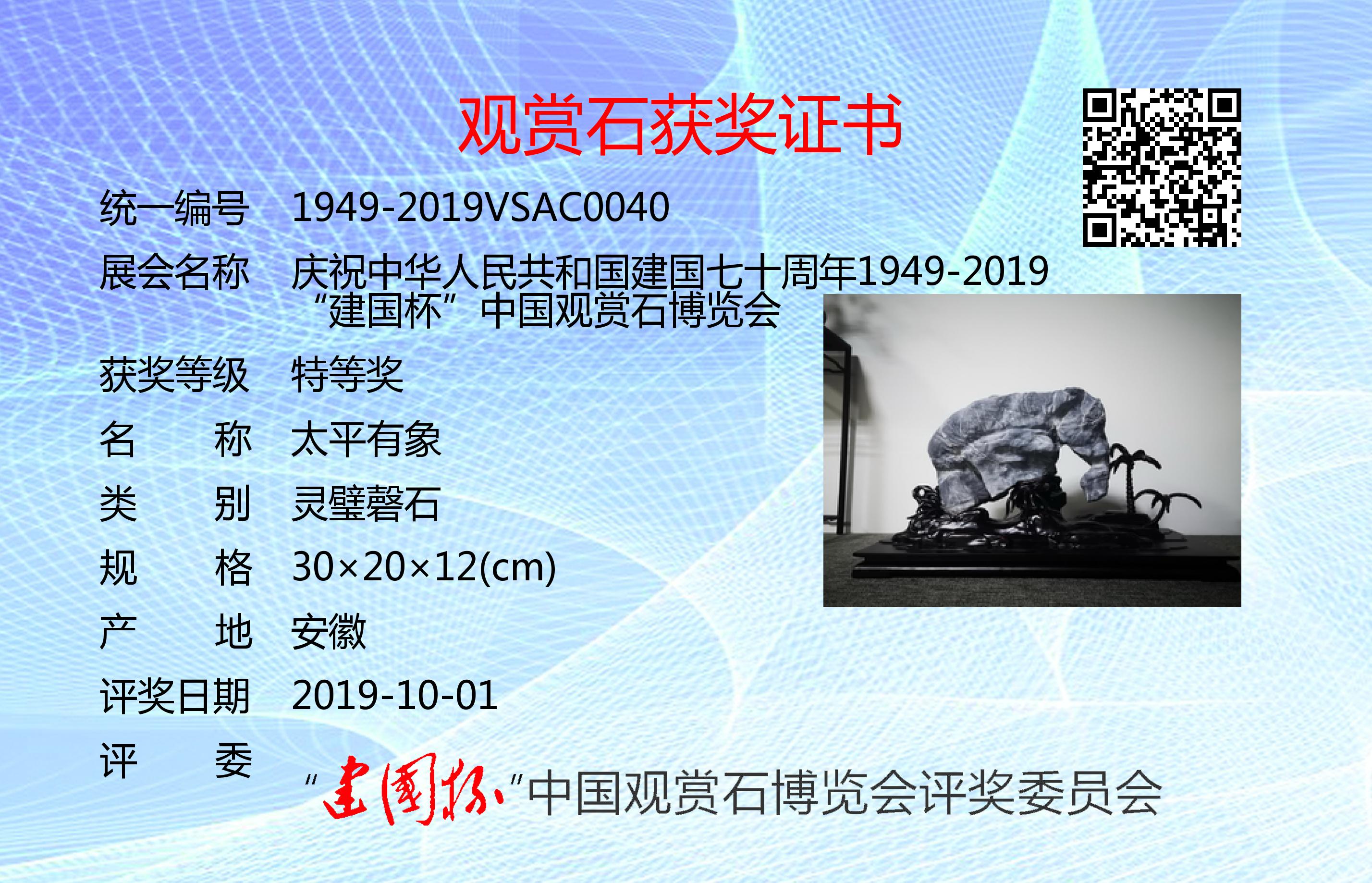 为庆祝建国七十周年,凝聚文化强国之力,推进赏石艺术发展,以最美的赏石精品向共和国生日献礼,特隆重举办了“建国杯”观赏石博览会。本次展会设特等奖、金奖、银奖、入围奖若干(各奖项不设名额限制,采用专家独立鉴评打分,平均鉴评得分91分以上获特等奖;81~90分获金奖;71~80分获银奖;61~70分获入围奖;61以下不获奖。鉴评标准:《观赏石鉴评》GB/T31390-2015)。本次评奖实际日期为2019年9月12日,为了突出纪念意义,证书上评奖日期统一为:2019年10月1日。