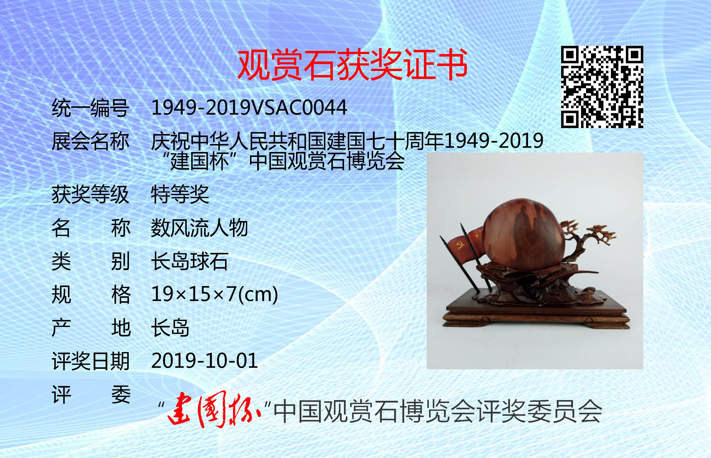 为庆祝建国七十周年,凝聚文化强国之力,推进赏石艺术发展,以最美的赏石精品向共和国生日献礼,特隆重举办了“建国杯”观赏石博览会。本次展会设特等奖、金奖、银奖、入围奖若干(各奖项不设名额限制,采用专家独立鉴评打分,平均鉴评得分91分以上获特等奖;81~90分获金奖;71~80分获银奖;61~70分获入围奖;61以下不获奖。鉴评标准:《观赏石鉴评》GB/T31390-2015)。本次评奖实际日期为2019年9月12日,为了突出纪念意义,证书上评奖日期统一为:2019年10月1日。