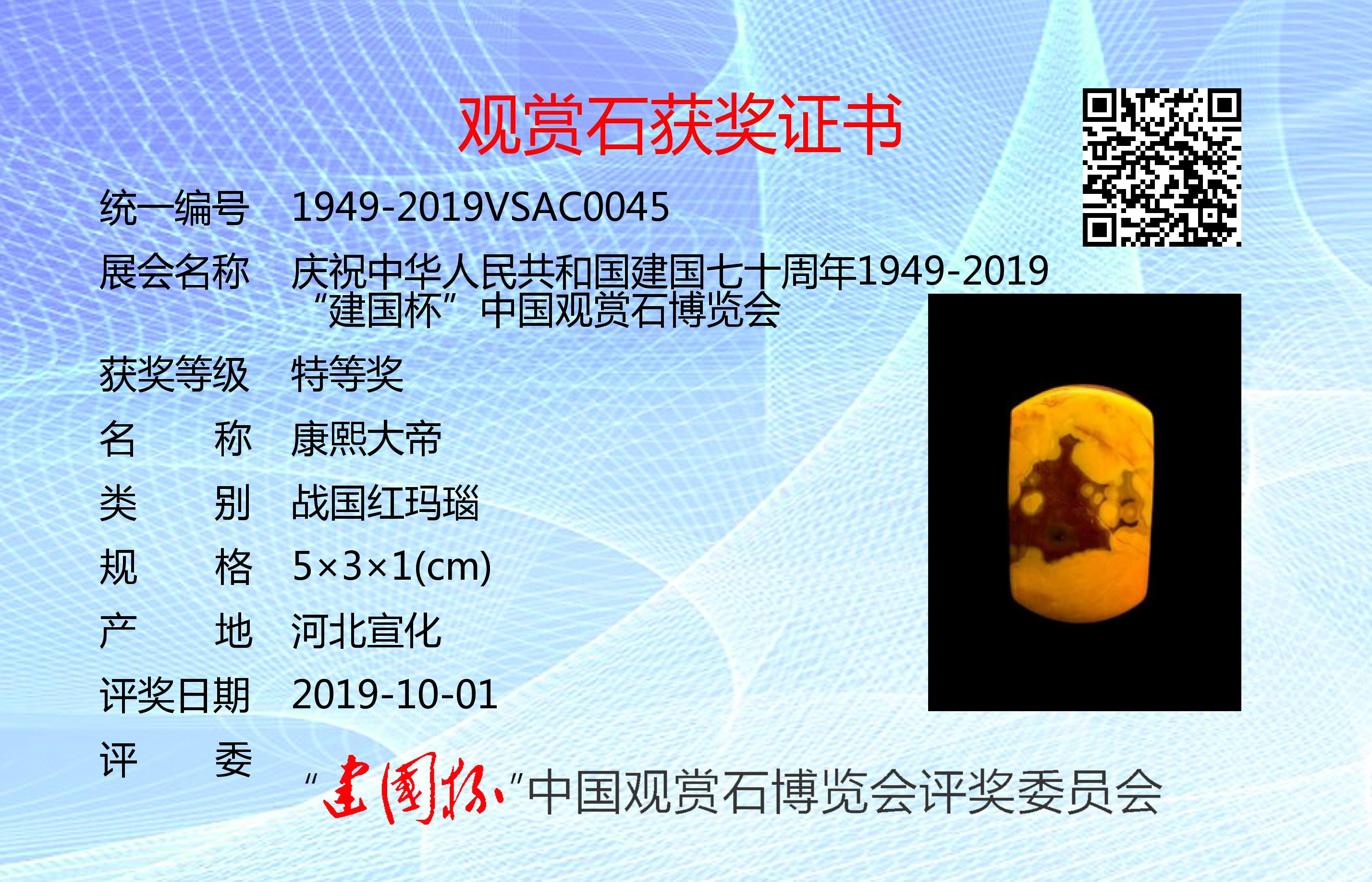 为庆祝建国七十周年,凝聚文化强国之力,推进赏石艺术发展,以最美的赏石精品向共和国生日献礼,特隆重举办了“建国杯”观赏石博览会。本次展会设特等奖、金奖、银奖、入围奖若干(各奖项不设名额限制,采用专家独立鉴评打分,平均鉴评得分91分以上获特等奖;81~90分获金奖;71~80分获银奖;61~70分获入围奖;61以下不获奖。鉴评标准:《观赏石鉴评》GB/T31390-2015)。本次评奖实际日期为2019年9月12日,为了突出纪念意义,证书上评奖日期统一为:2019年10月1日。