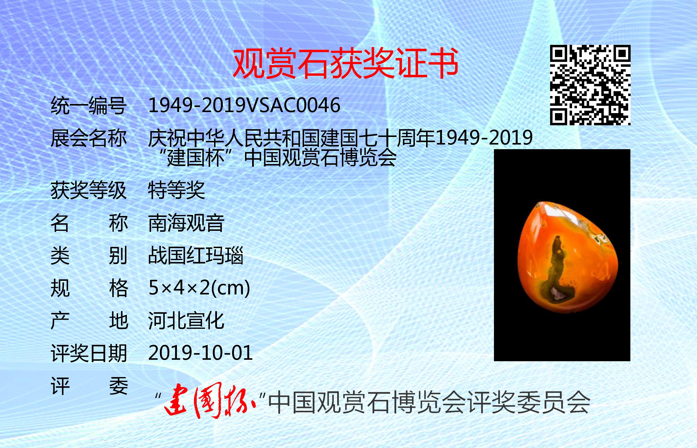 为庆祝建国七十周年,凝聚文化强国之力,推进赏石艺术发展,以最美的赏石精品向共和国生日献礼,特隆重举办了“建国杯”观赏石博览会。本次展会设特等奖、金奖、银奖、入围奖若干(各奖项不设名额限制,采用专家独立鉴评打分,平均鉴评得分91分以上获特等奖;81~90分获金奖;71~80分获银奖;61~70分获入围奖;61以下不获奖。鉴评标准:《观赏石鉴评》GB/T31390-2015)。本次评奖实际日期为2019年9月12日,为了突出纪念意义,证书上评奖日期统一为:2019年10月1日。