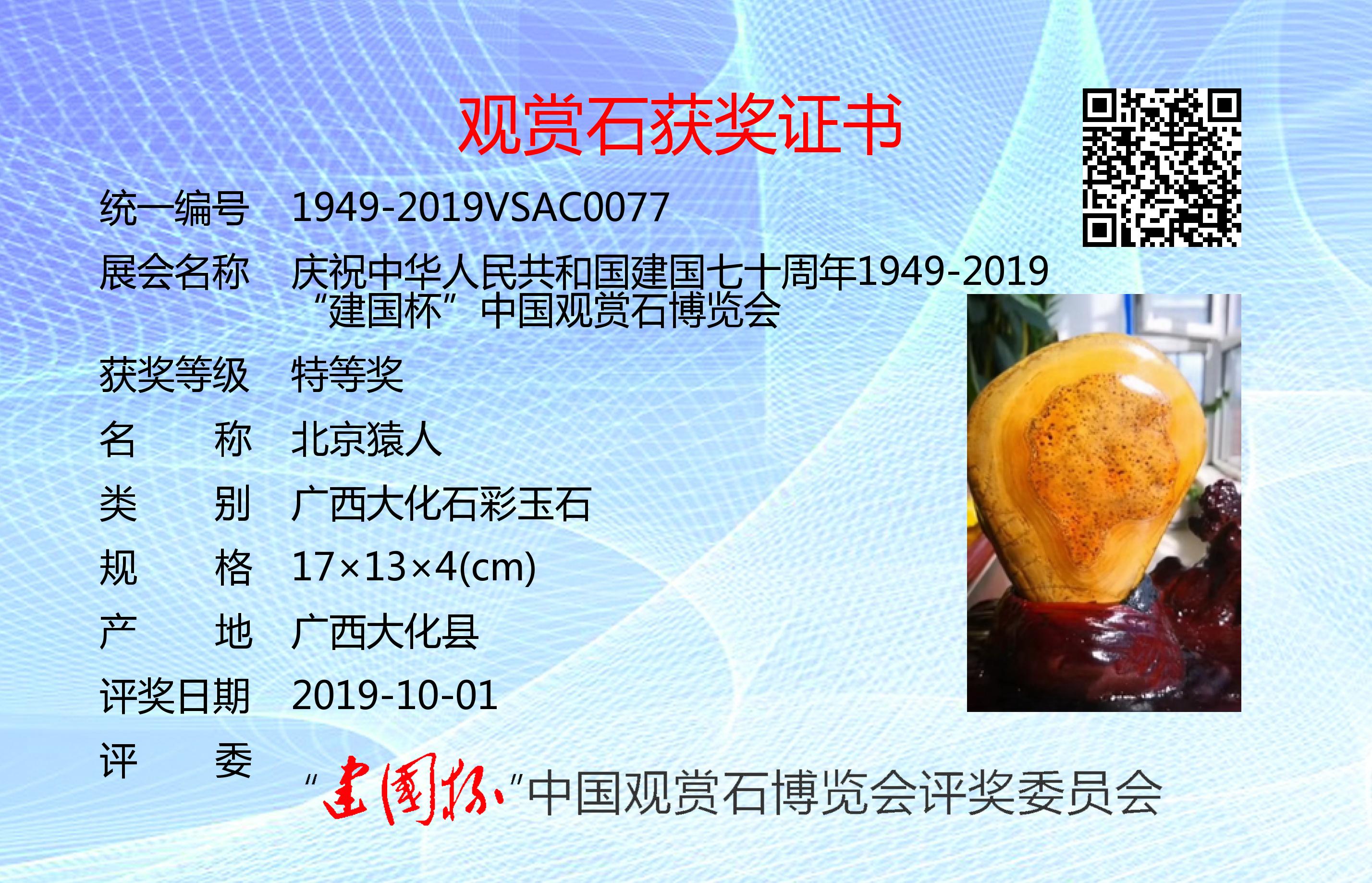 为庆祝建国七十周年,凝聚文化强国之力,推进赏石艺术发展,以最美的赏石精品向共和国生日献礼,特隆重举办了“建国杯”观赏石博览会。本次展会设特等奖、金奖、银奖、入围奖若干(各奖项不设名额限制,采用专家独立鉴评打分,平均鉴评得分91分以上获特等奖;81~90分获金奖;71~80分获银奖;61~70分获入围奖;61以下不获奖。鉴评标准:《观赏石鉴评》GB/T31390-2015)。本次评奖实际日期为2019年9月12日,为了突出纪念意义,证书上评奖日期统一为:2019年10月1日。