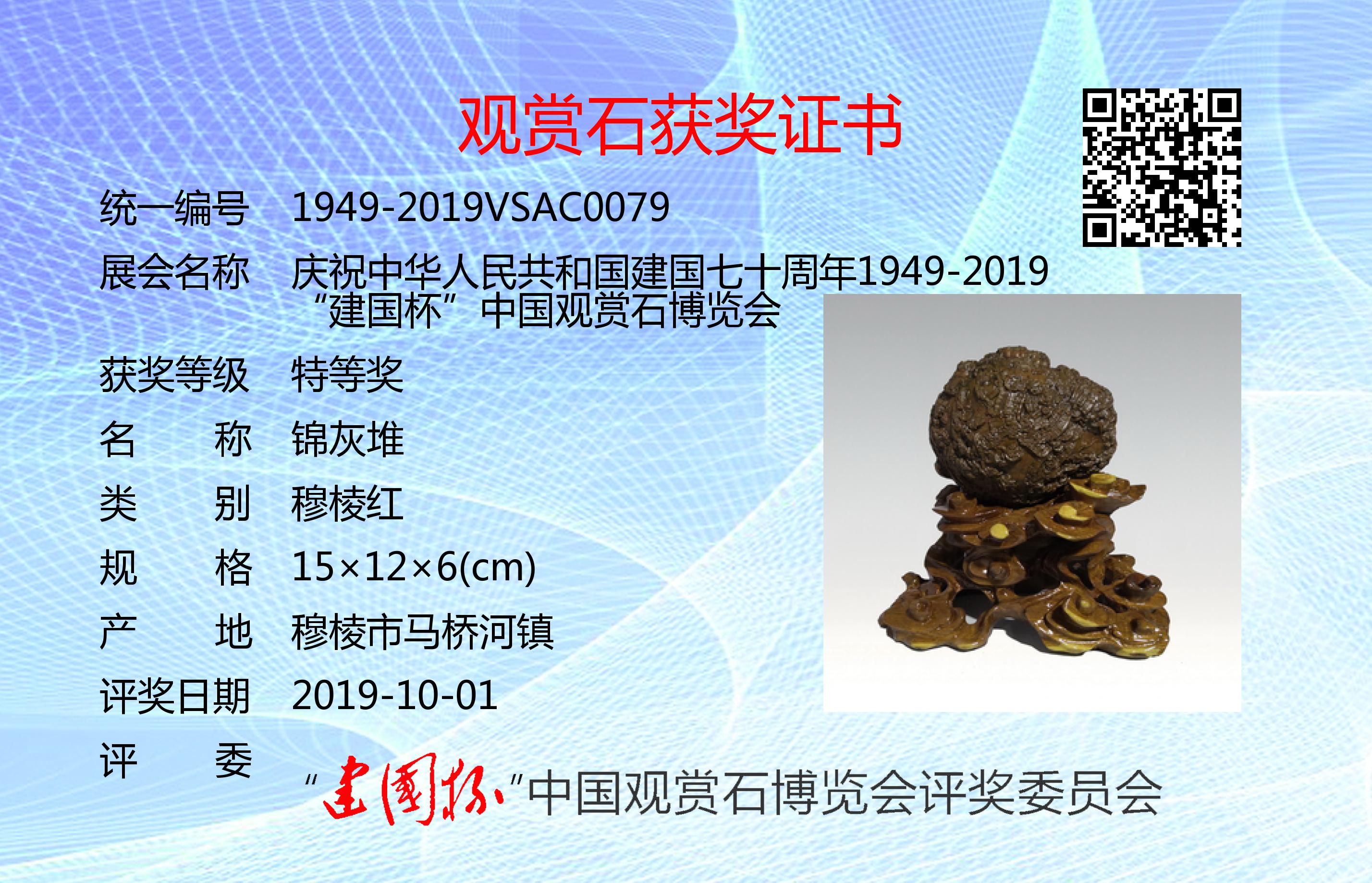 为庆祝建国七十周年,凝聚文化强国之力,推进赏石艺术发展,以最美的赏石精品向共和国生日献礼,特隆重举办了“建国杯”观赏石博览会。本次展会设特等奖、金奖、银奖、入围奖若干(各奖项不设名额限制,采用专家独立鉴评打分,平均鉴评得分91分以上获特等奖;81~90分获金奖;71~80分获银奖;61~70分获入围奖;61以下不获奖。鉴评标准:《观赏石鉴评》GB/T31390-2015)。本次评奖实际日期为2019年9月12日,为了突出纪念意义,证书上评奖日期统一为:2019年10月1日。