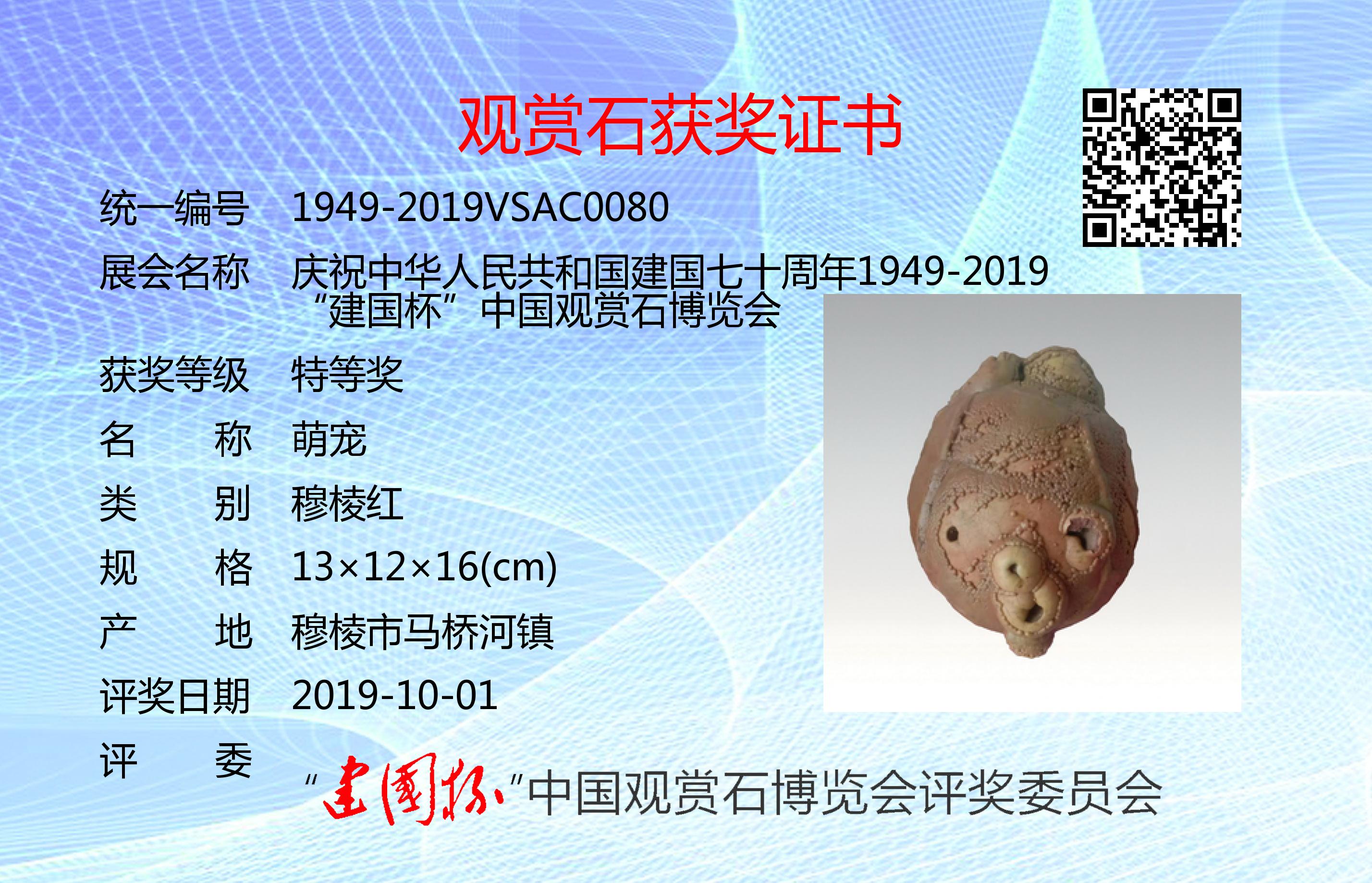 为庆祝建国七十周年,凝聚文化强国之力,推进赏石艺术发展,以最美的赏石精品向共和国生日献礼,特隆重举办了“建国杯”观赏石博览会。本次展会设特等奖、金奖、银奖、入围奖若干(各奖项不设名额限制,采用专家独立鉴评打分,平均鉴评得分91分以上获特等奖;81~90分获金奖;71~80分获银奖;61~70分获入围奖;61以下不获奖。鉴评标准:《观赏石鉴评》GB/T31390-2015)。本次评奖实际日期为2019年9月12日,为了突出纪念意义,证书上评奖日期统一为:2019年10月1日。