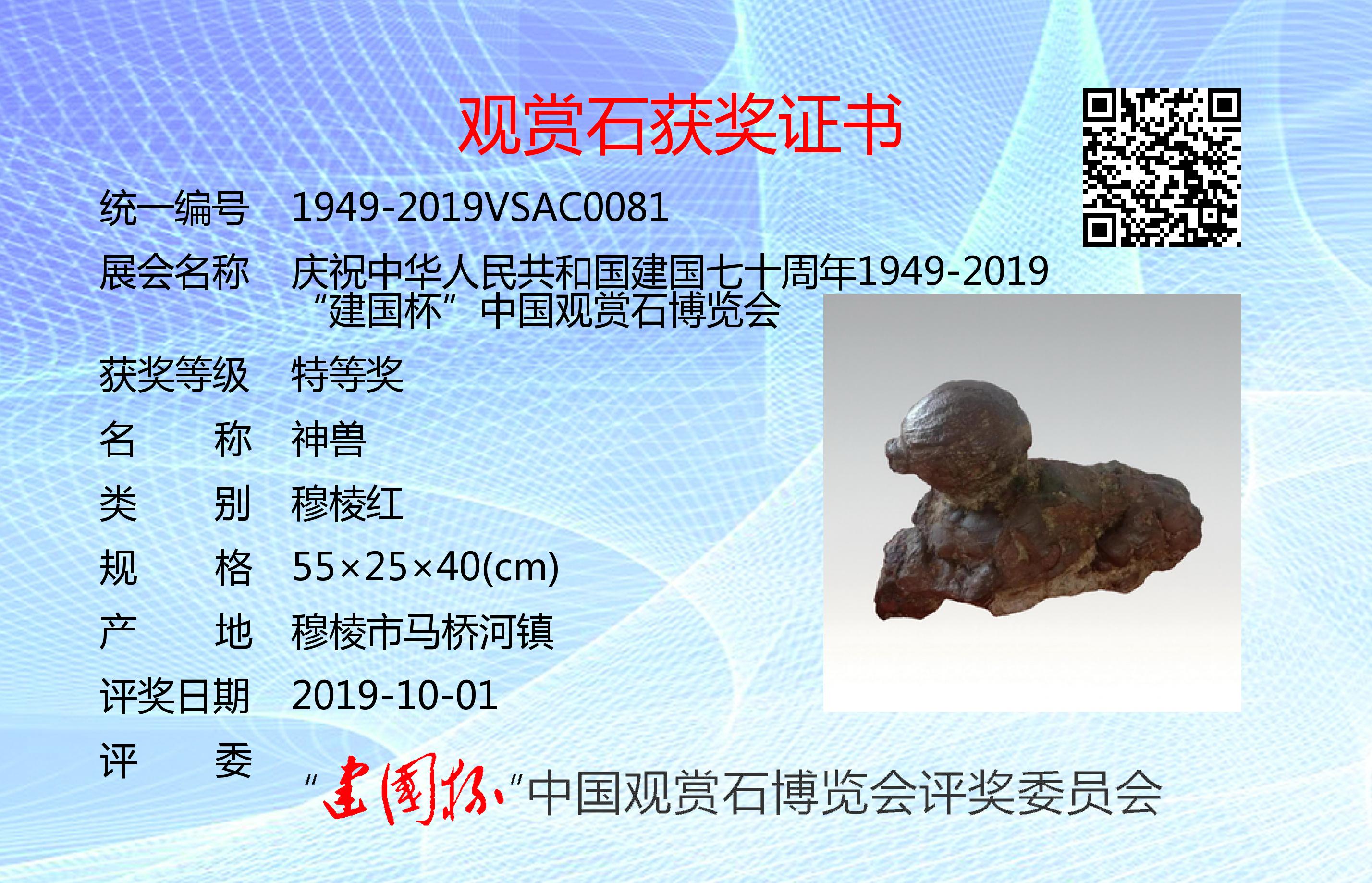 为庆祝建国七十周年,凝聚文化强国之力,推进赏石艺术发展,以最美的赏石精品向共和国生日献礼,特隆重举办了“建国杯”观赏石博览会。本次展会设特等奖、金奖、银奖、入围奖若干(各奖项不设名额限制,采用专家独立鉴评打分,平均鉴评得分91分以上获特等奖;81~90分获金奖;71~80分获银奖;61~70分获入围奖;61以下不获奖。鉴评标准:《观赏石鉴评》GB/T31390-2015)。本次评奖实际日期为2019年9月12日,为了突出纪念意义,证书上评奖日期统一为:2019年10月1日。
