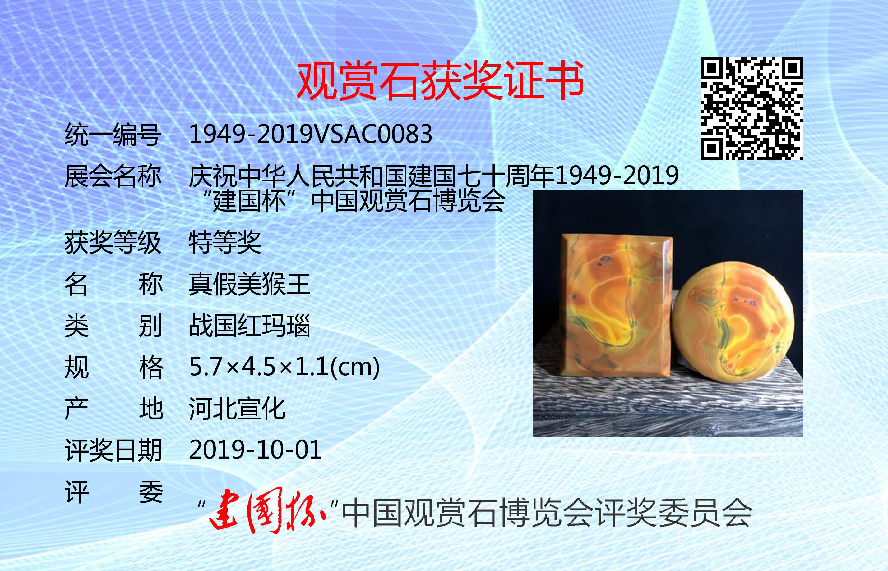 为庆祝建国七十周年,凝聚文化强国之力,推进赏石艺术发展,以最美的赏石精品向共和国生日献礼,特隆重举办了“建国杯”观赏石博览会。本次展会设特等奖、金奖、银奖、入围奖若干(各奖项不设名额限制,采用专家独立鉴评打分,平均鉴评得分91分以上获特等奖;81~90分获金奖;71~80分获银奖;61~70分获入围奖;61以下不获奖。鉴评标准:《观赏石鉴评》GB/T31390-2015)。本次评奖实际日期为2019年9月12日,为了突出纪念意义,证书上评奖日期统一为:2019年10月1日。
