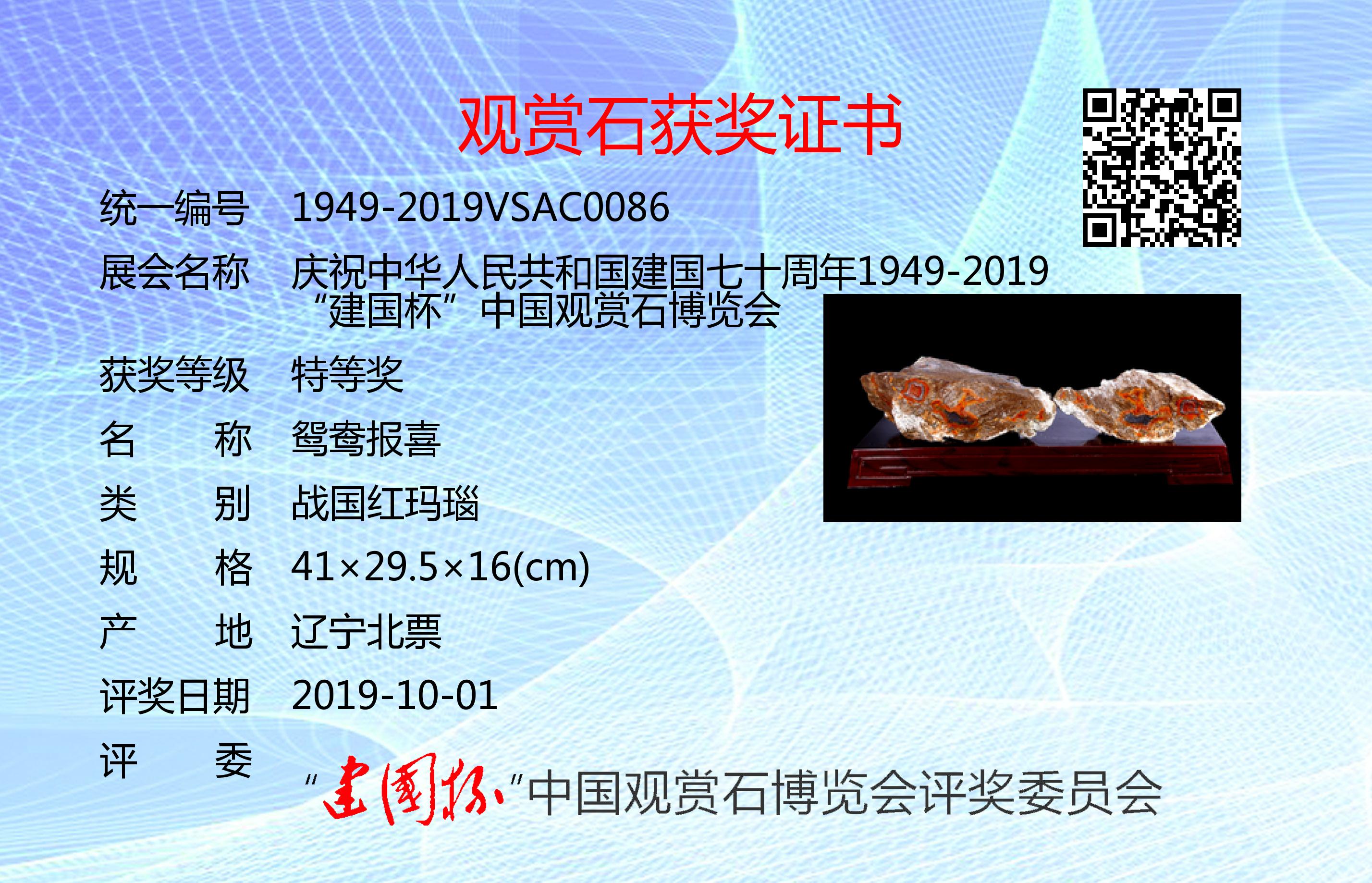 为庆祝建国七十周年,凝聚文化强国之力,推进赏石艺术发展,以最美的赏石精品向共和国生日献礼,特隆重举办了“建国杯”观赏石博览会。本次展会设特等奖、金奖、银奖、入围奖若干(各奖项不设名额限制,采用专家独立鉴评打分,平均鉴评得分91分以上获特等奖;81~90分获金奖;71~80分获银奖;61~70分获入围奖;61以下不获奖。鉴评标准:《观赏石鉴评》GB/T31390-2015)。本次评奖实际日期为2019年9月12日,为了突出纪念意义,证书上评奖日期统一为:2019年10月1日。