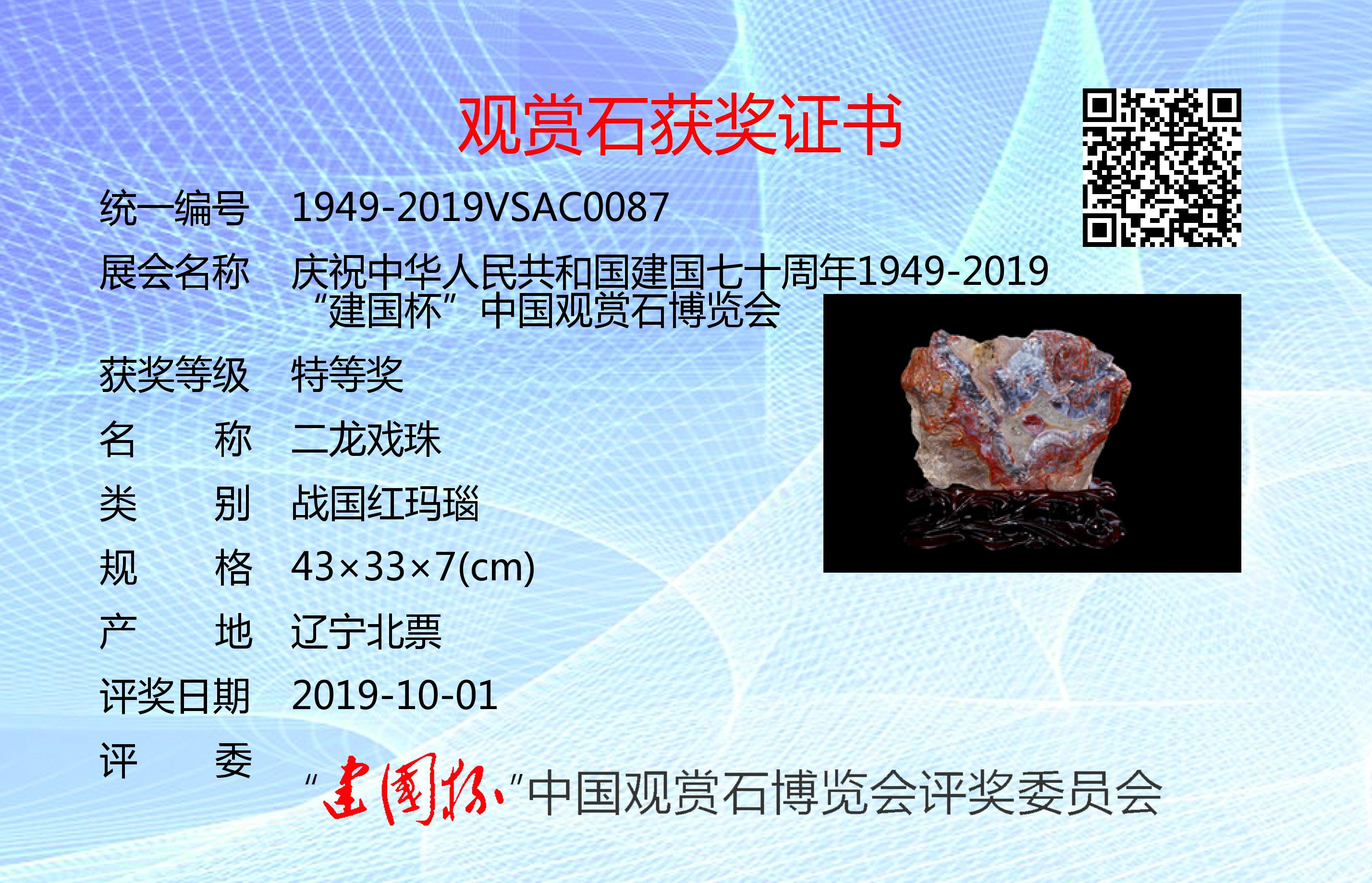 为庆祝建国七十周年,凝聚文化强国之力,推进赏石艺术发展,以最美的赏石精品向共和国生日献礼,特隆重举办了“建国杯”观赏石博览会。本次展会设特等奖、金奖、银奖、入围奖若干(各奖项不设名额限制,采用专家独立鉴评打分,平均鉴评得分91分以上获特等奖;81~90分获金奖;71~80分获银奖;61~70分获入围奖;61以下不获奖。鉴评标准:《观赏石鉴评》GB/T31390-2015)。本次评奖实际日期为2019年9月12日,为了突出纪念意义,证书上评奖日期统一为:2019年10月1日。