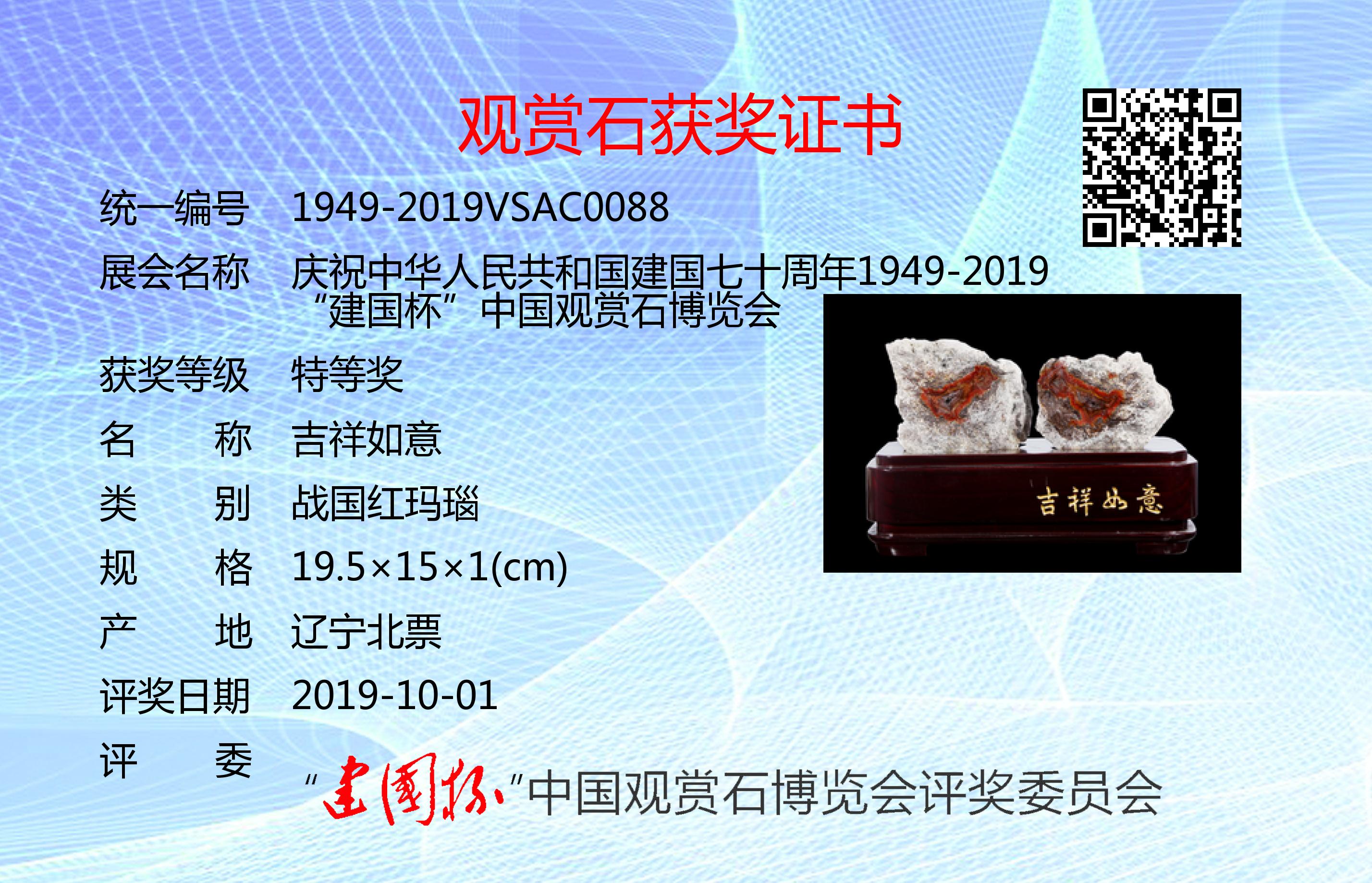 为庆祝建国七十周年,凝聚文化强国之力,推进赏石艺术发展,以最美的赏石精品向共和国生日献礼,特隆重举办了“建国杯”观赏石博览会。本次展会设特等奖、金奖、银奖、入围奖若干(各奖项不设名额限制,采用专家独立鉴评打分,平均鉴评得分91分以上获特等奖;81~90分获金奖;71~80分获银奖;61~70分获入围奖;61以下不获奖。鉴评标准:《观赏石鉴评》GB/T31390-2015)。本次评奖实际日期为2019年9月12日,为了突出纪念意义,证书上评奖日期统一为:2019年10月1日。