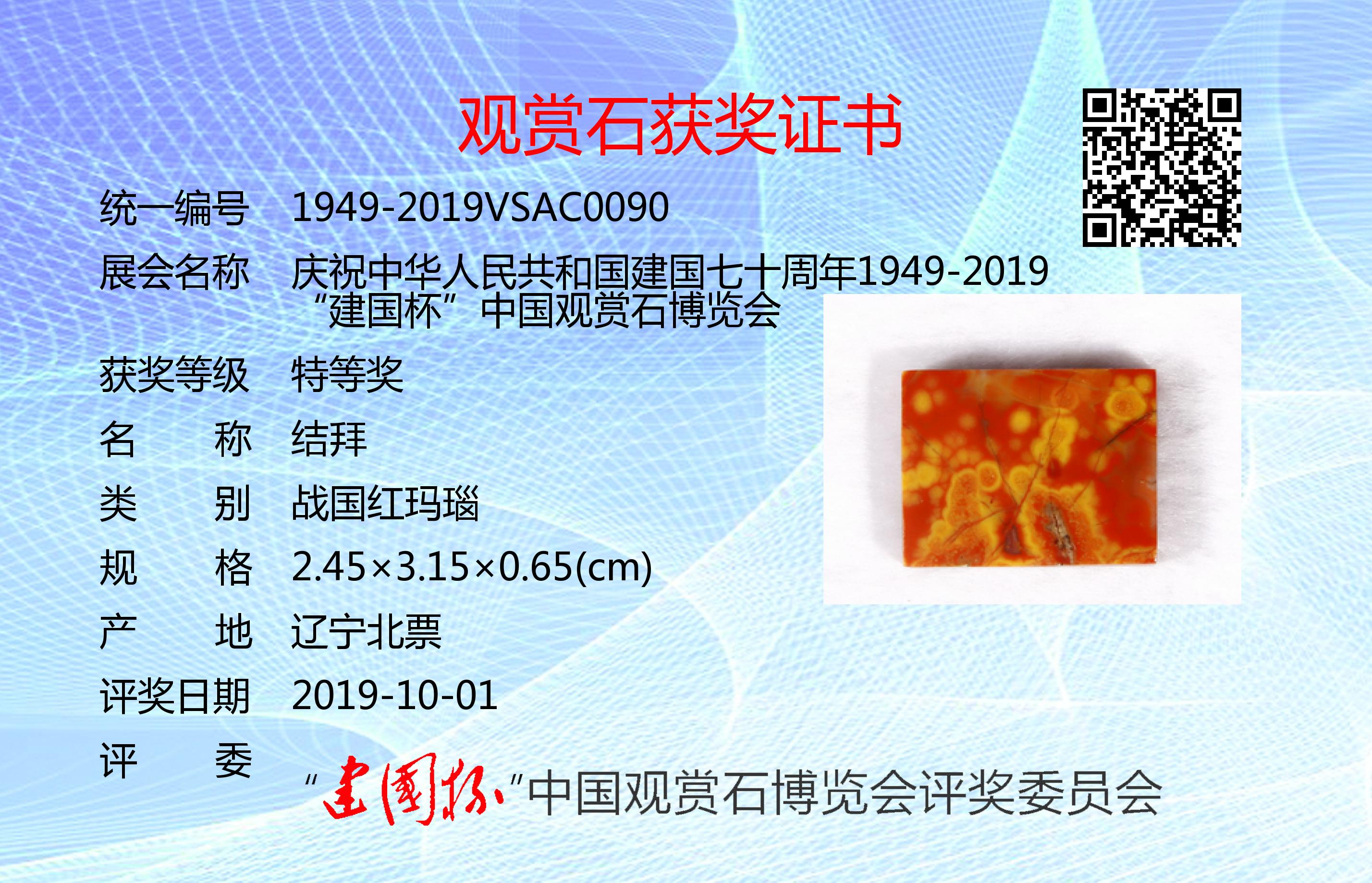 为庆祝建国七十周年,凝聚文化强国之力,推进赏石艺术发展,以最美的赏石精品向共和国生日献礼,特隆重举办了“建国杯”观赏石博览会。本次展会设特等奖、金奖、银奖、入围奖若干(各奖项不设名额限制,采用专家独立鉴评打分,平均鉴评得分91分以上获特等奖;81~90分获金奖;71~80分获银奖;61~70分获入围奖;61以下不获奖。鉴评标准:《观赏石鉴评》GB/T31390-2015)。本次评奖实际日期为2019年9月12日,为了突出纪念意义,证书上评奖日期统一为:2019年10月1日。