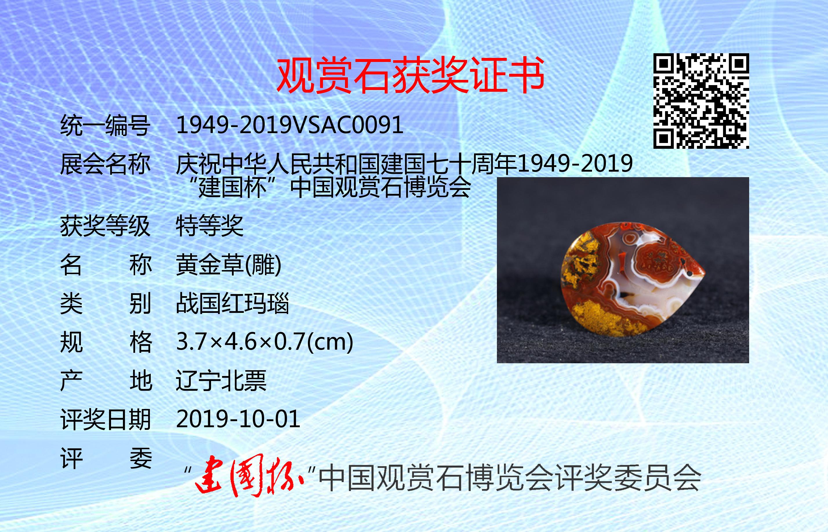 为庆祝建国七十周年,凝聚文化强国之力,推进赏石艺术发展,以最美的赏石精品向共和国生日献礼,特隆重举办了“建国杯”观赏石博览会。本次展会设特等奖、金奖、银奖、入围奖若干(各奖项不设名额限制,采用专家独立鉴评打分,平均鉴评得分91分以上获特等奖;81~90分获金奖;71~80分获银奖;61~70分获入围奖;61以下不获奖。鉴评标准:《观赏石鉴评》GB/T31390-2015)。本次评奖实际日期为2019年9月12日,为了突出纪念意义,证书上评奖日期统一为:2019年10月1日。