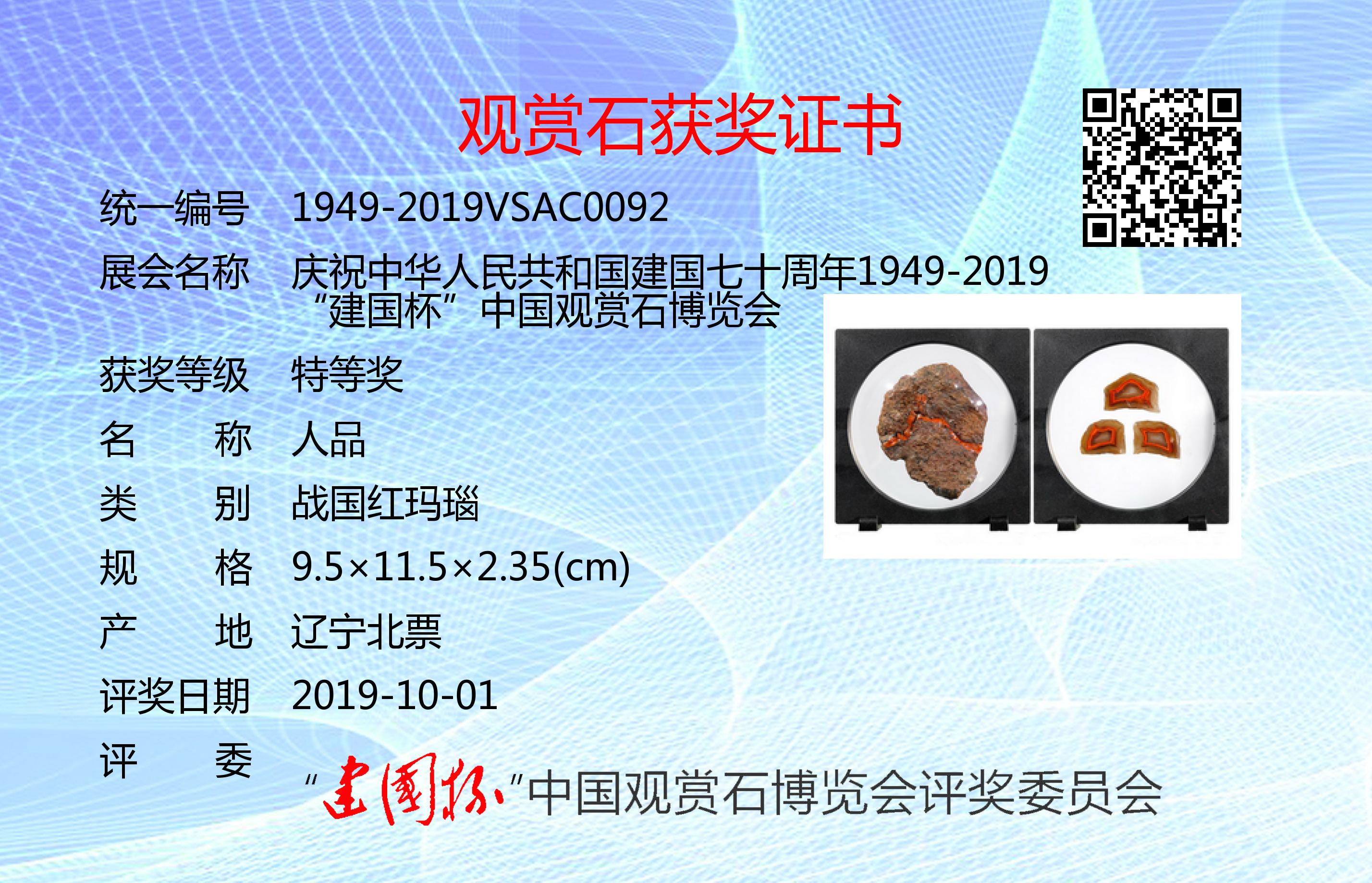 为庆祝建国七十周年,凝聚文化强国之力,推进赏石艺术发展,以最美的赏石精品向共和国生日献礼,特隆重举办了“建国杯”观赏石博览会。本次展会设特等奖、金奖、银奖、入围奖若干(各奖项不设名额限制,采用专家独立鉴评打分,平均鉴评得分91分以上获特等奖;81~90分获金奖;71~80分获银奖;61~70分获入围奖;61以下不获奖。鉴评标准:《观赏石鉴评》GB/T31390-2015)。本次评奖实际日期为2019年9月12日,为了突出纪念意义,证书上评奖日期统一为:2019年10月1日。
