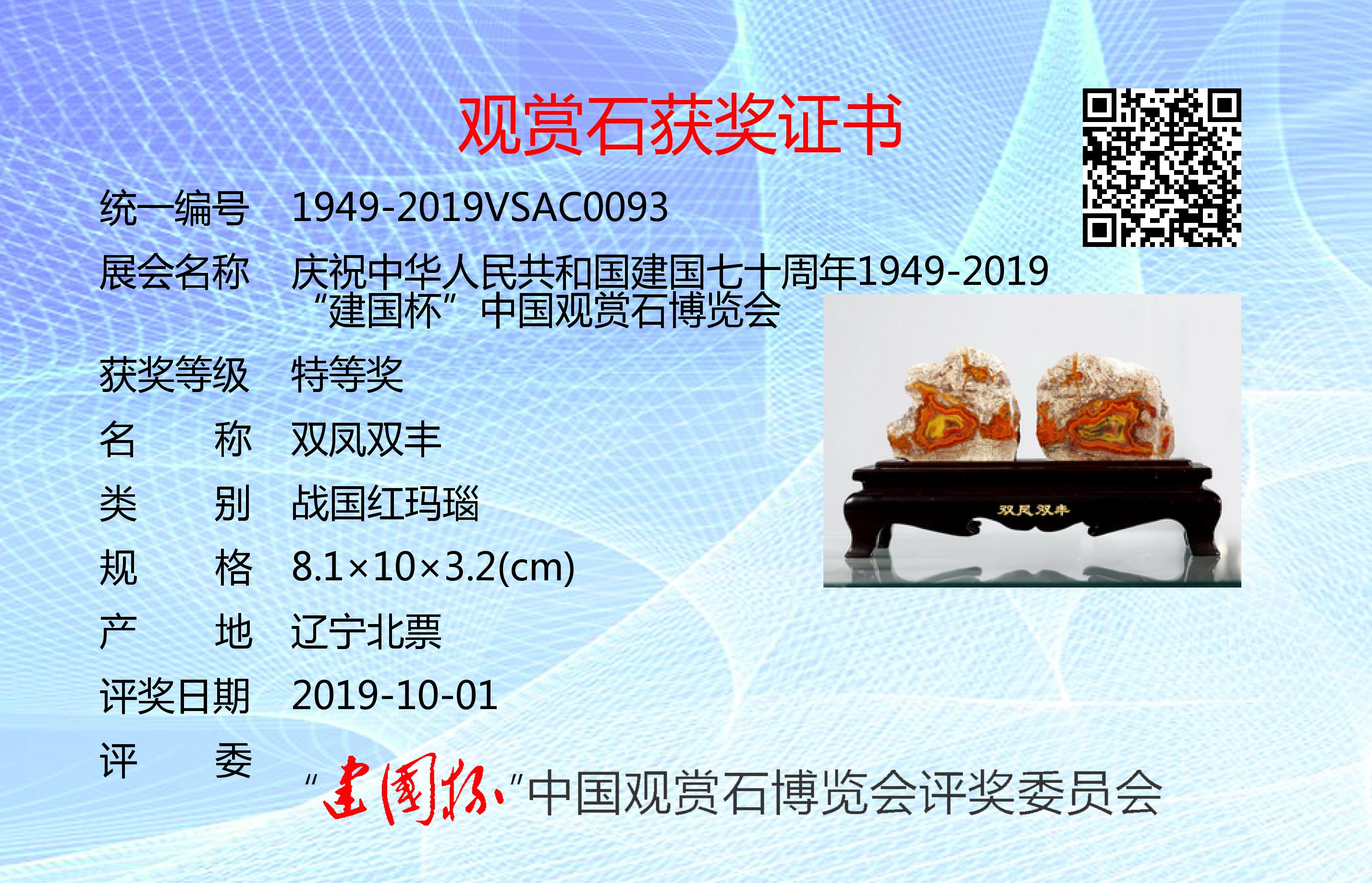 为庆祝建国七十周年,凝聚文化强国之力,推进赏石艺术发展,以最美的赏石精品向共和国生日献礼,特隆重举办了“建国杯”观赏石博览会。本次展会设特等奖、金奖、银奖、入围奖若干(各奖项不设名额限制,采用专家独立鉴评打分,平均鉴评得分91分以上获特等奖;81~90分获金奖;71~80分获银奖;61~70分获入围奖;61以下不获奖。鉴评标准:《观赏石鉴评》GB/T31390-2015)。本次评奖实际日期为2019年9月12日,为了突出纪念意义,证书上评奖日期统一为:2019年10月1日。
