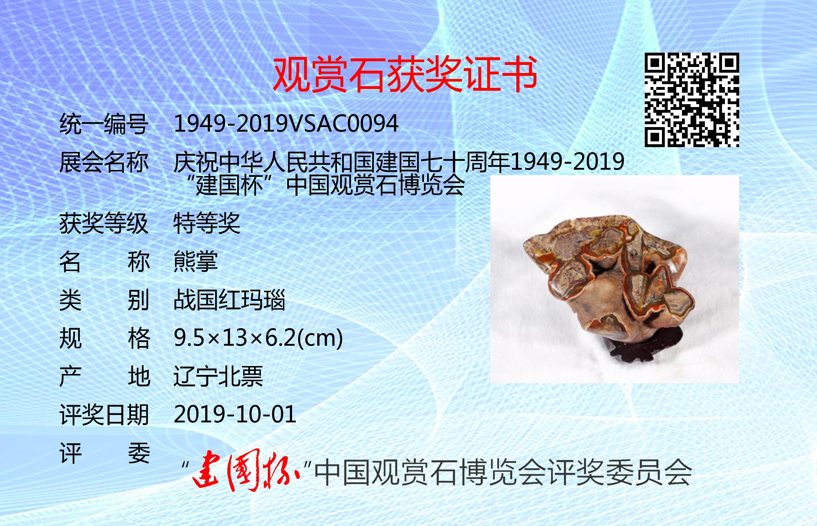 为庆祝建国七十周年,凝聚文化强国之力,推进赏石艺术发展,以最美的赏石精品向共和国生日献礼,特隆重举办了“建国杯”观赏石博览会。本次展会设特等奖、金奖、银奖、入围奖若干(各奖项不设名额限制,采用专家独立鉴评打分,平均鉴评得分91分以上获特等奖;81~90分获金奖;71~80分获银奖;61~70分获入围奖;61以下不获奖。鉴评标准:《观赏石鉴评》GB/T31390-2015)。本次评奖实际日期为2019年9月12日,为了突出纪念意义,证书上评奖日期统一为:2019年10月1日。