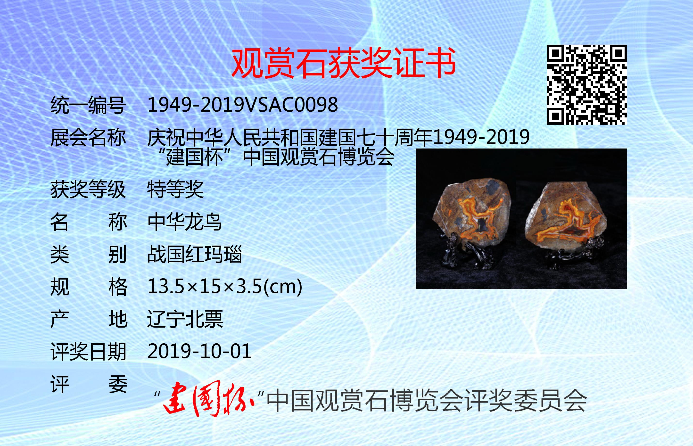 为庆祝建国七十周年,凝聚文化强国之力,推进赏石艺术发展,以最美的赏石精品向共和国生日献礼,特隆重举办了“建国杯”观赏石博览会。本次展会设特等奖、金奖、银奖、入围奖若干(各奖项不设名额限制,采用专家独立鉴评打分,平均鉴评得分91分以上获特等奖;81~90分获金奖;71~80分获银奖;61~70分获入围奖;61以下不获奖。鉴评标准:《观赏石鉴评》GB/T31390-2015)。本次评奖实际日期为2019年9月12日,为了突出纪念意义,证书上评奖日期统一为:2019年10月1日。