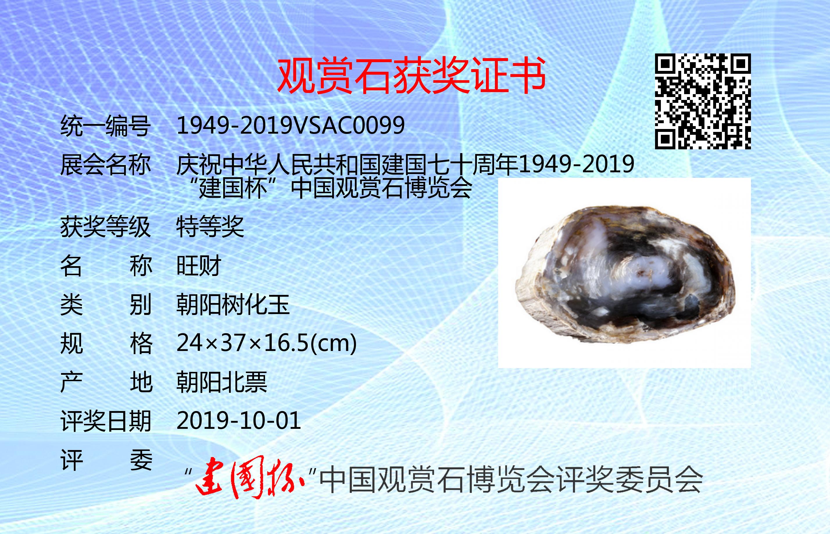 为庆祝建国七十周年,凝聚文化强国之力,推进赏石艺术发展,以最美的赏石精品向共和国生日献礼,特隆重举办了“建国杯”观赏石博览会。本次展会设特等奖、金奖、银奖、入围奖若干(各奖项不设名额限制,采用专家独立鉴评打分,平均鉴评得分91分以上获特等奖;81~90分获金奖;71~80分获银奖;61~70分获入围奖;61以下不获奖。鉴评标准:《观赏石鉴评》GB/T31390-2015)。本次评奖实际日期为2019年9月12日,为了突出纪念意义,证书上评奖日期统一为:2019年10月1日。