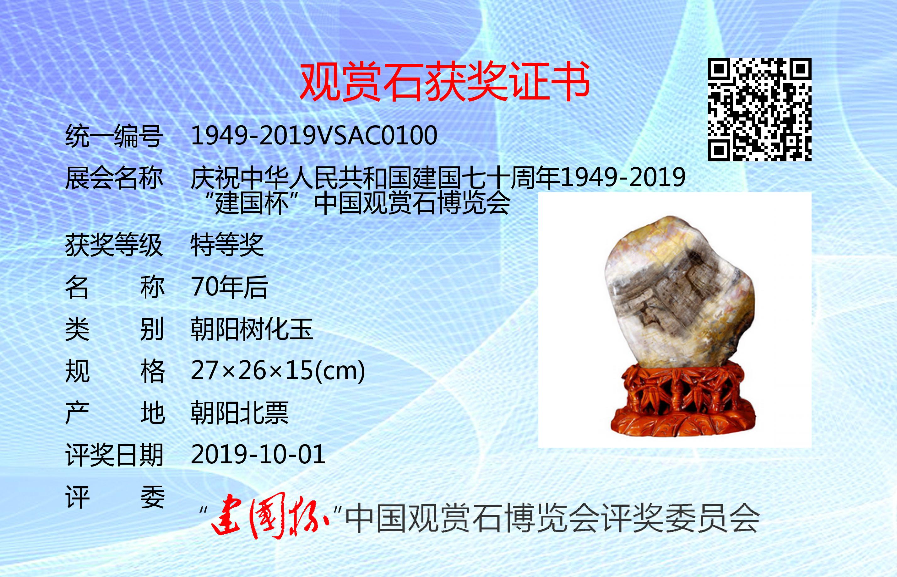 为庆祝建国七十周年,凝聚文化强国之力,推进赏石艺术发展,以最美的赏石精品向共和国生日献礼,特隆重举办了“建国杯”观赏石博览会。本次展会设特等奖、金奖、银奖、入围奖若干(各奖项不设名额限制,采用专家独立鉴评打分,平均鉴评得分91分以上获特等奖;81~90分获金奖;71~80分获银奖;61~70分获入围奖;61以下不获奖。鉴评标准:《观赏石鉴评》GB/T31390-2015)。本次评奖实际日期为2019年9月12日,为了突出纪念意义,证书上评奖日期统一为:2019年10月1日。